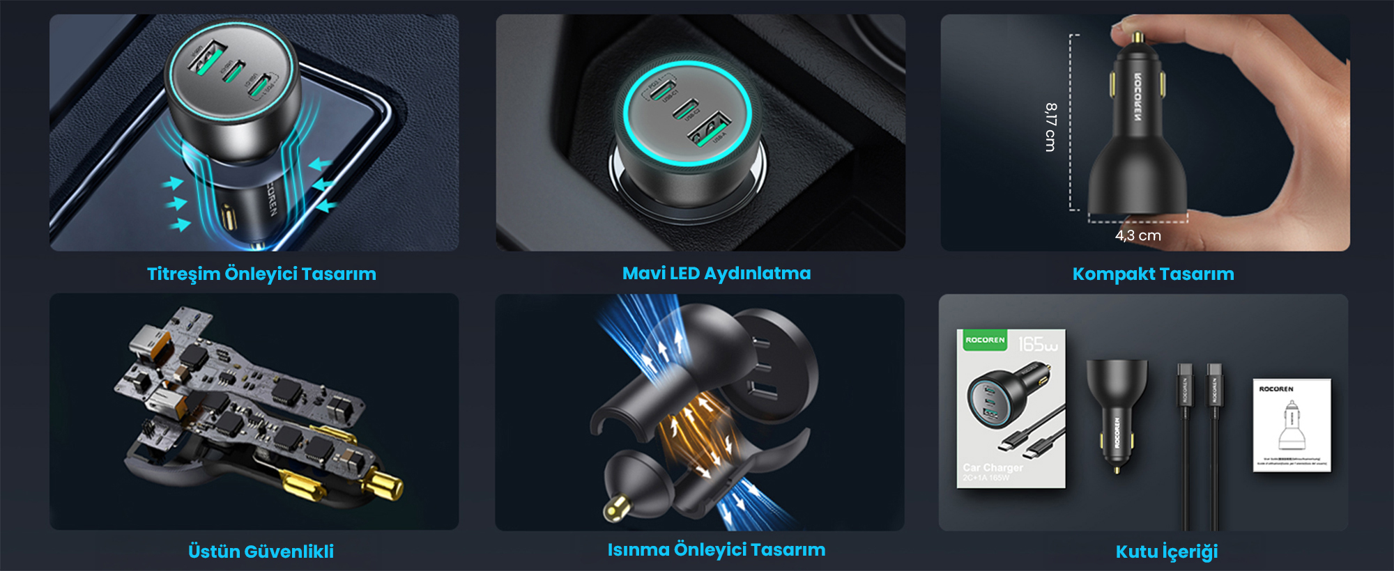 Rocoren 165W 3 Portlu Hızlı Araç Şarj Cihazı, yeni nesil PD 3.1 teknolojisiyle dizüstü bilgisayarlardan akıllı telefonlara kadar tüm cihazlarınızı araç içinde güvenle ve maksimum hızda şarj etmek için tasarlanmıştır. İki adet Type-C ve bir adet USB-A portu sayesinde aynı anda üç farklı cihazı performans kaybı yaşamadan şarj etmenize olanak tanır. Kutu içeriğine dahil olan 240W destekli E-Marker çipli şarj kablosu ile kutudan çıktığı an yüksek hızda kullanıma hazırdır.