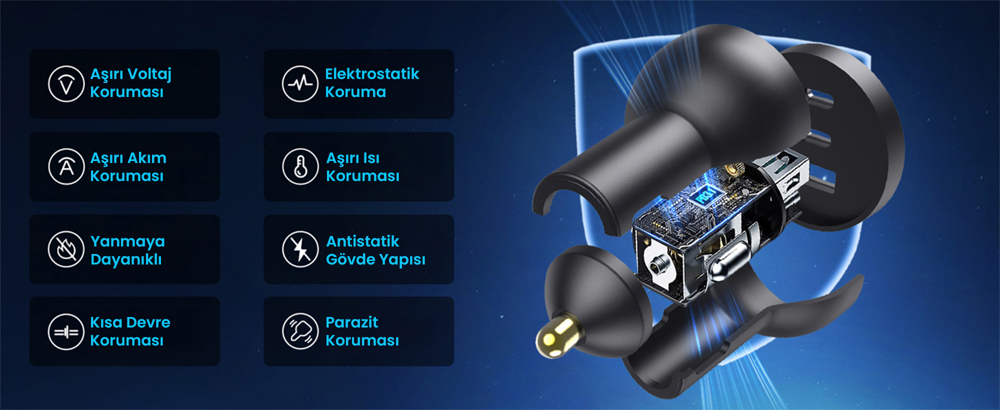 Yanmaz PC (Polikarbonat) malzemeden üretilen gövdesi ve entegre akıllı çipi sayesinde cihazlarınızı aşırı akım, aşırı voltaj, kısa devre ve elektrostatik dalgalanmalara karşı korur. Özel olarak tasarlanmış ısı dağıtım yapısı (nefes alan gövde), uzun süreli ve çoklu şarj işlemlerinde bile cihazın güvenli sıcaklıklarda kalmasına yardımcı olur.