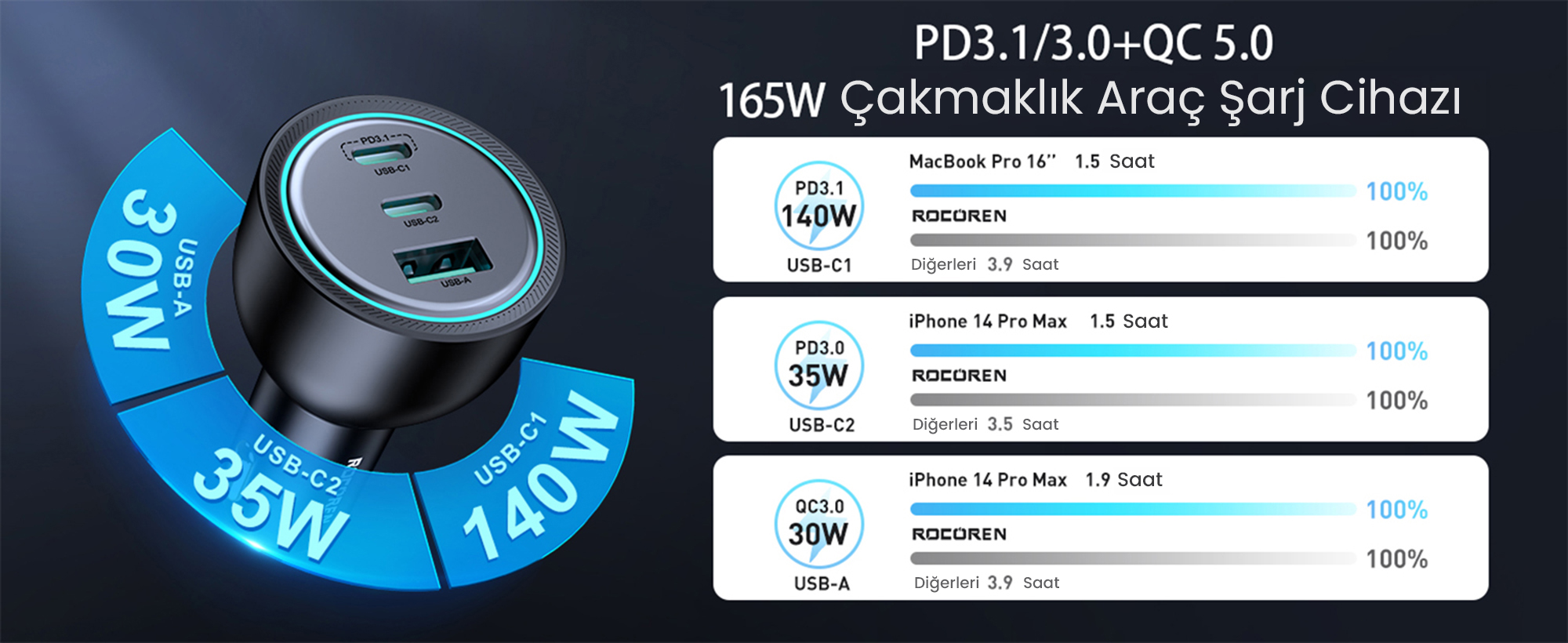 1 x Rocoren 165W (2C+1A) Araç Şarj Cihazı
