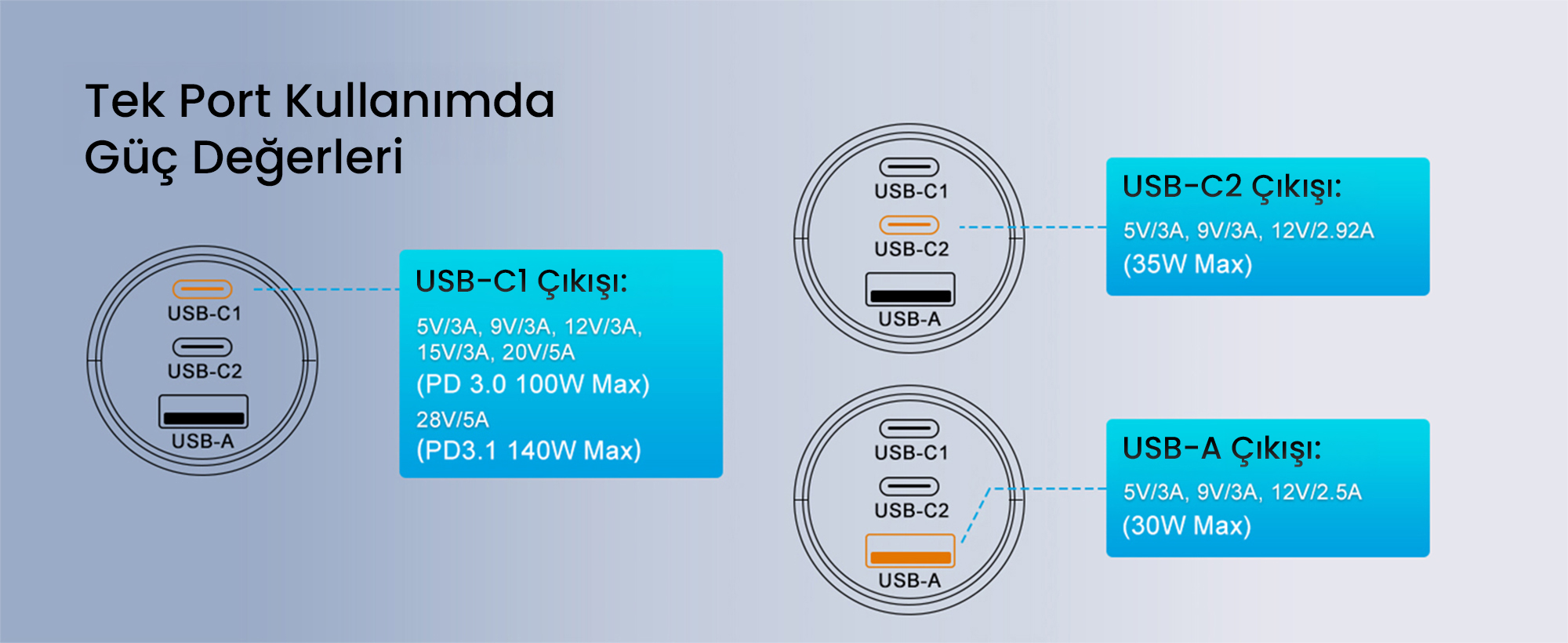 USB-A Çıkışı: 5V=3A; 9V=3A; 12V=2.5A (30W Max / QC 3.0)