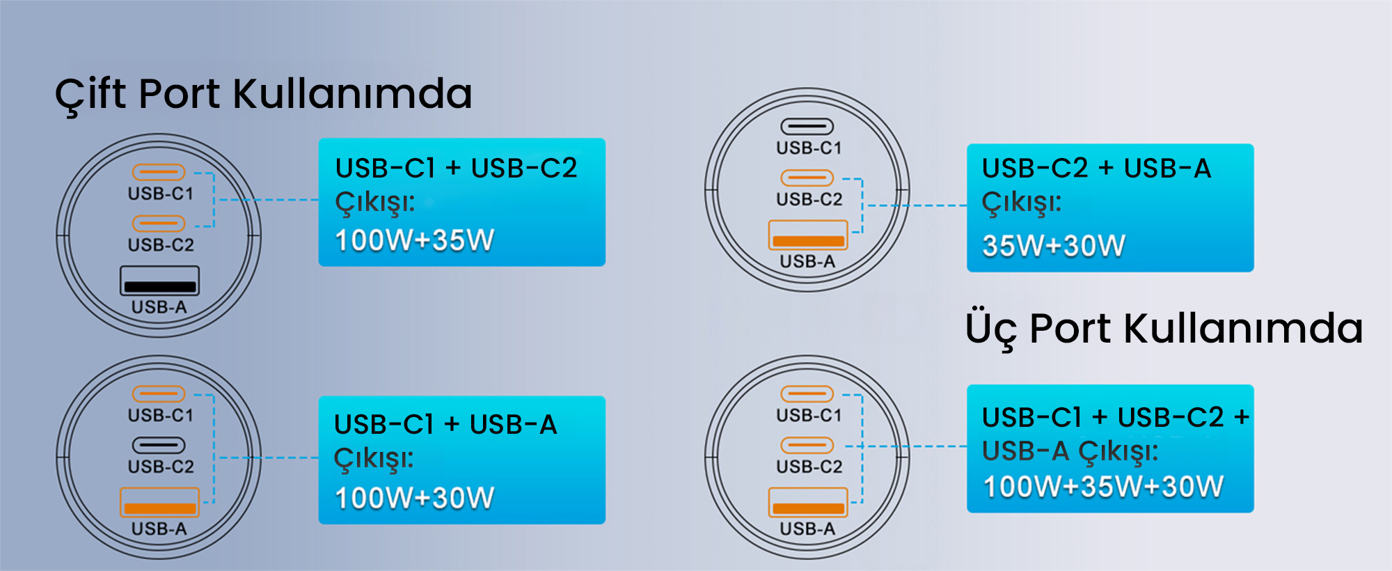 Çoklu Çıkış Desteği: USB-C1 + USB-C2 + USB-A = 100W + 35W + 30W