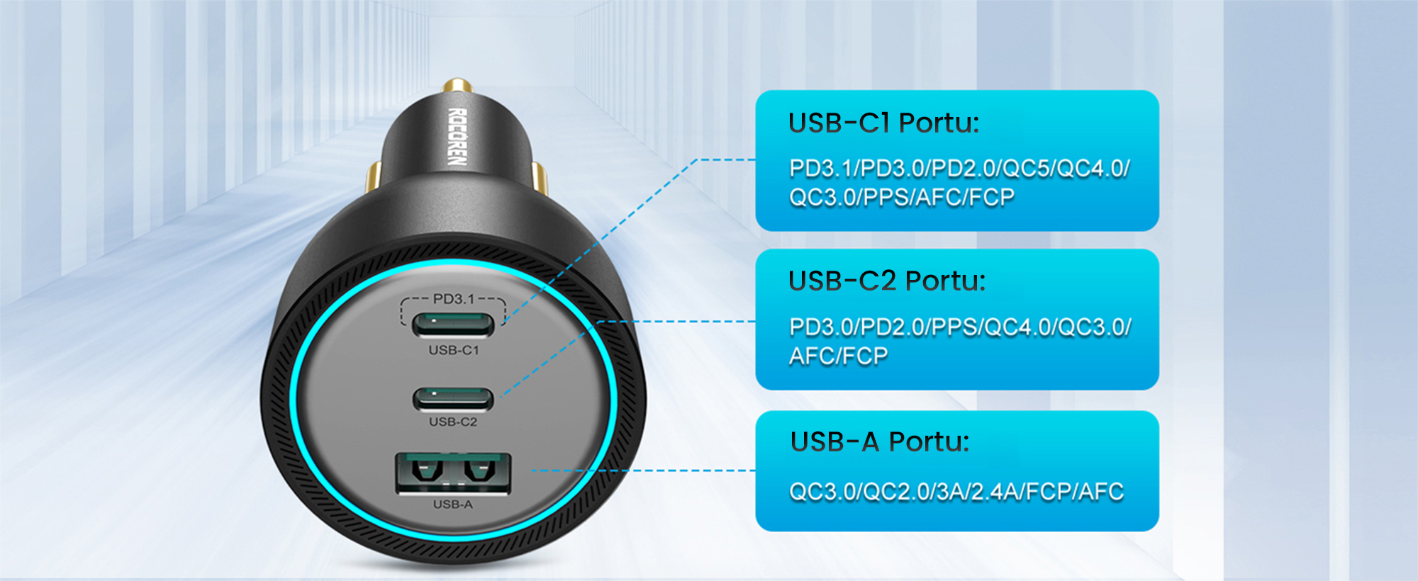 Type-C ve USB-A arayüzlü dizüstü bilgisayarlar, tabletler, telefonlar ve kulaklıkların araç içi şarjı.