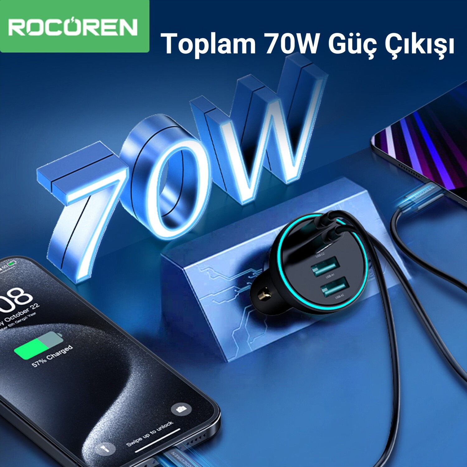 Rocoren 70W Araç İçi Hızlı Şarj Cihazı, aynı anda birden fazla cihazı yüksek hızda şarj etmek isteyen kullanıcılar için tasarlanmıştır. 2x USB-C + 2x USB-A çıkışıyla toplamda 4 cihaza kadar şarj imkânı sunar. Her bir port, güçlü ve dengeli enerji aktarımıyla telefon, tablet ve diğer elektronik cihazlarınızı güvenli bir şekilde besler.