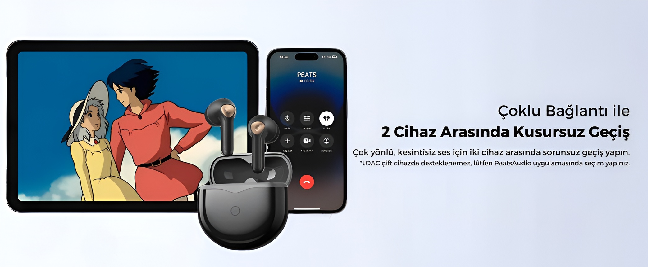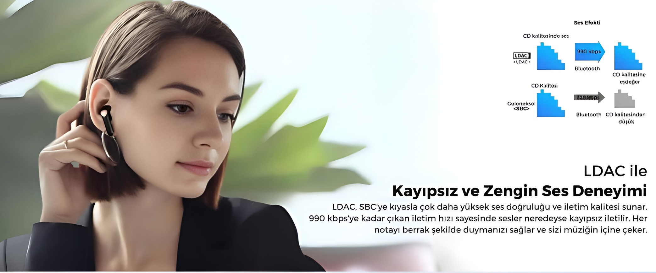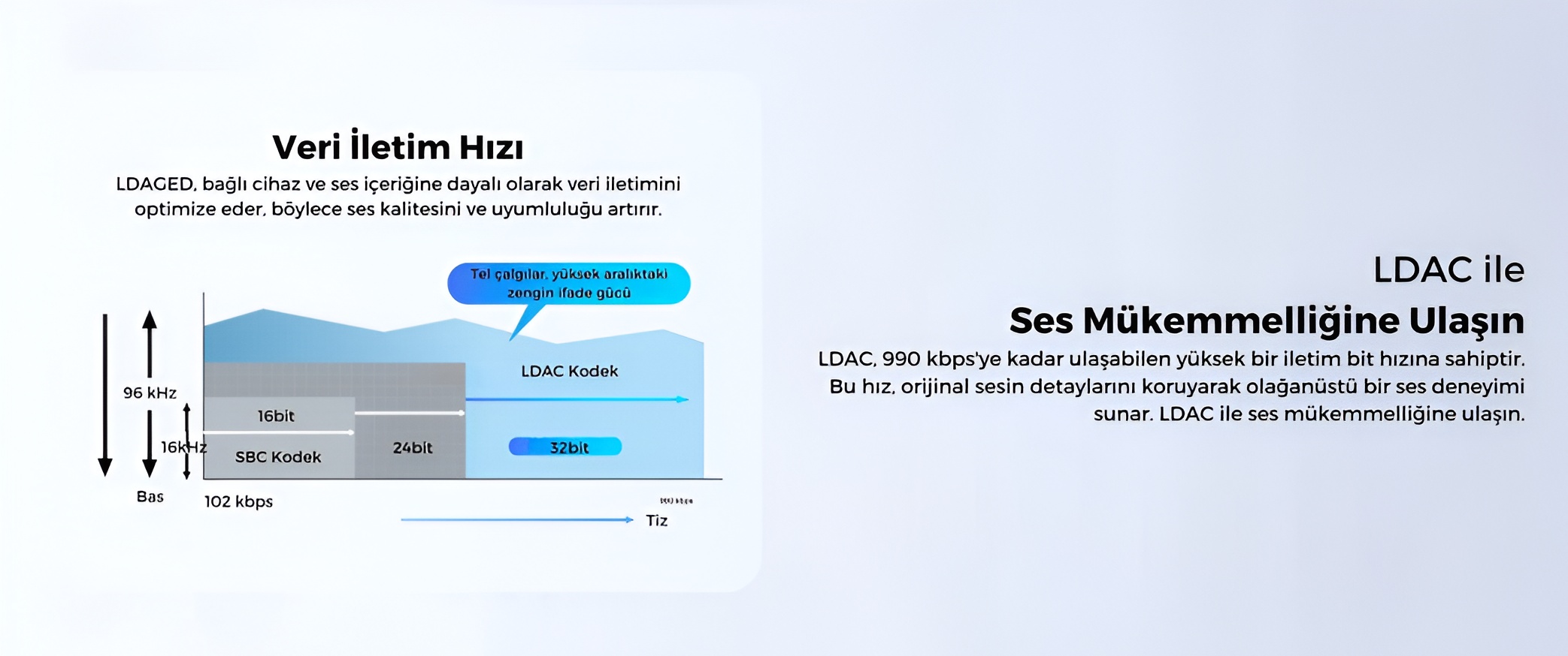 LDAC, AAC ve SBC codec’leri ile yüksek çözünürlüklü ve dengeli ses deneyimi sunar.
