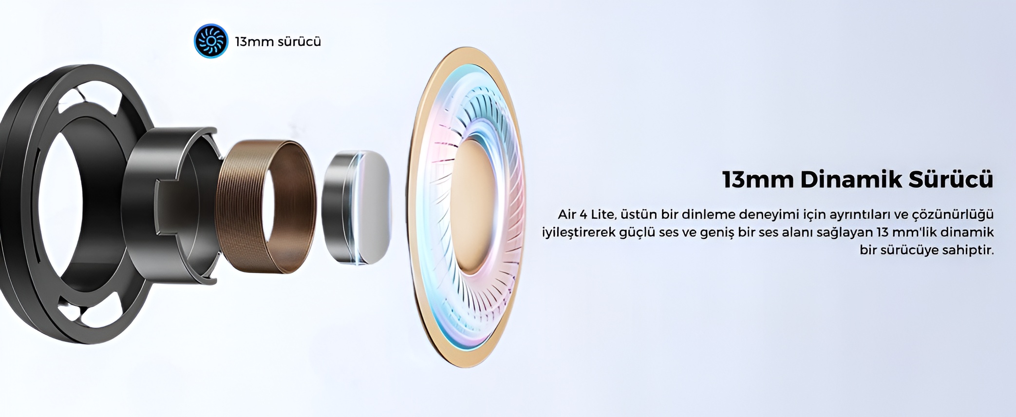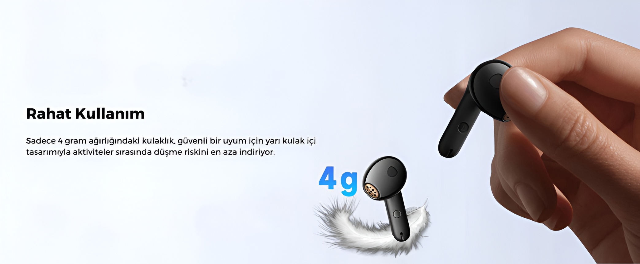 SoundPEATS Air4 Lite, kompakt tasarımı ve yüksek ses kalitesiyle günlük kullanıma uygun bir TWS kulaklıktır. Bluetooth 5.3 ve WQ7033AX chipset ile kararlı ve düşük gecikmeli bağlantı sunarken, LDAC, AAC ve SBC codec desteği sayesinde Hi-Res ses deneyimi sağlar. Her biri 35 mAh bataryaya sahip kulaklıklar ve 330 mAh şarj kutusu ile toplamda 40 saate kadar kullanım süresi sunar. IPX4 sertifikasıyla su sıçramalarına karşı dayanıklıdır, bu da onu dış mekân kullanımına uygun hâle getirir. Sadece 4 gramlık hafif yapısı ve dokunmatik kontrol özelliğiyle konforlu ve pratik bir kullanım sağlar.