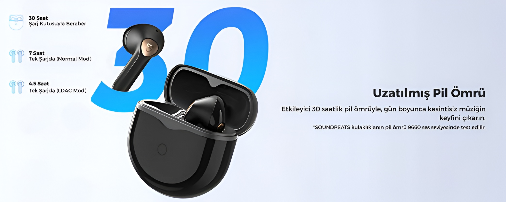 Kulaklıklar ve şarj kutusuyla birlikte toplamda 40 saate kadar kesintisiz müzik dinleme imkanı sunar.
