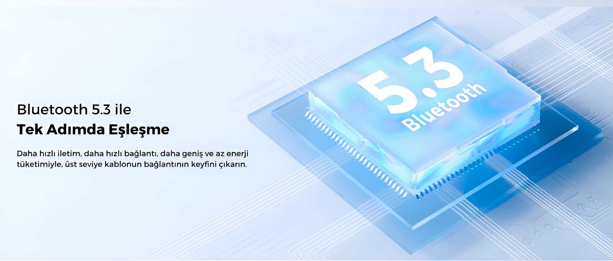Bluetooth 5.3 teknolojisi ile hızlı, stabil ve düşük gecikmeli bağlantı sağlar.