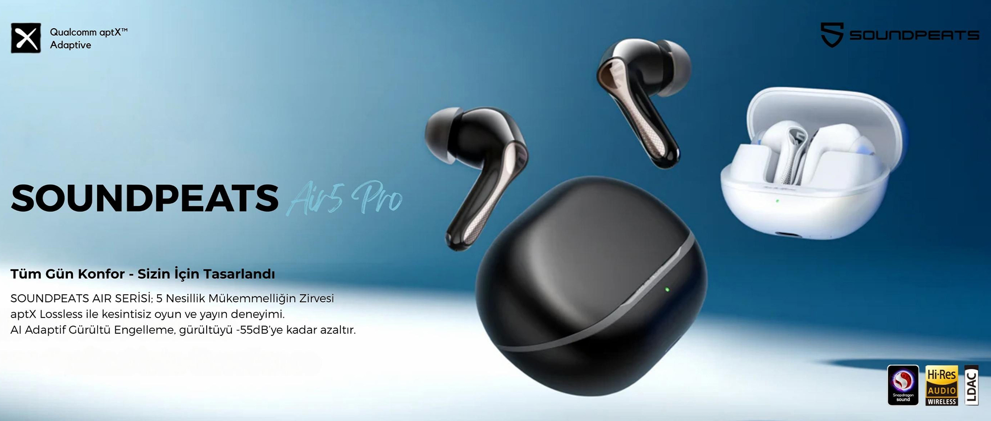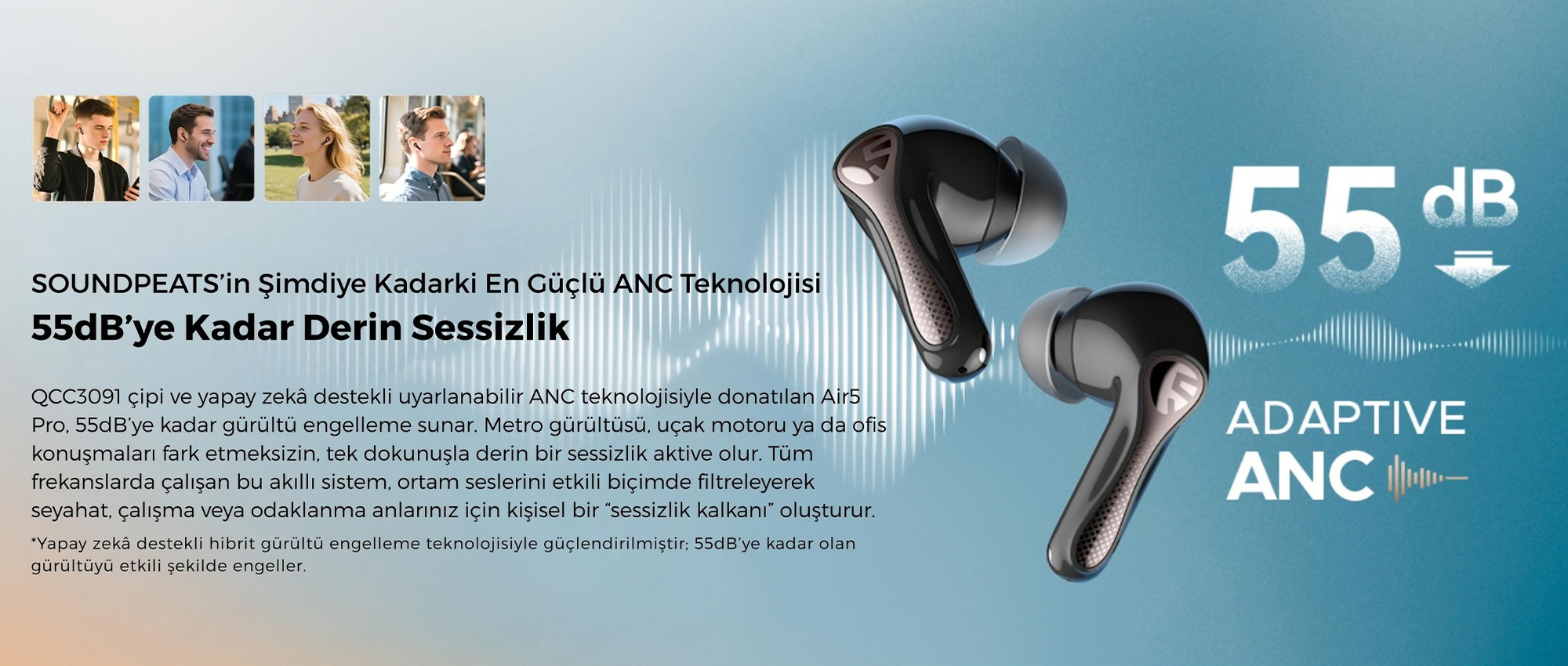 Evet. SoundPEATS Air5 Pro, AI destekli adaptif hibrit ANC teknolojisi ile çevresel gürültüyü 55dB’e kadar azaltarak daha sessiz ve odaklanmış bir dinleme deneyimi sunar.