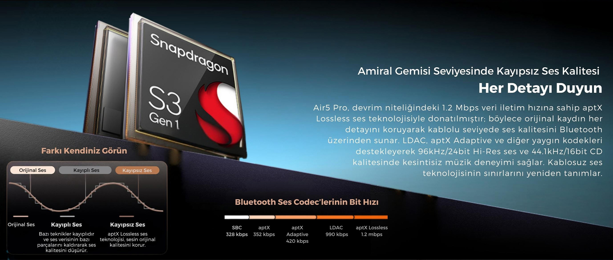 Evet. Qualcomm QCC3091 chipseti, Snapdragon Sound™ ve Hi-Res Audio Wireless sertifikaları sayesinde yüksek çözünürlüklü ses deneyimi sunar. aptX Lossless ve LDAC desteği ile kablosuz ortamda kayıpsız sese çok yakın performans sağlar.