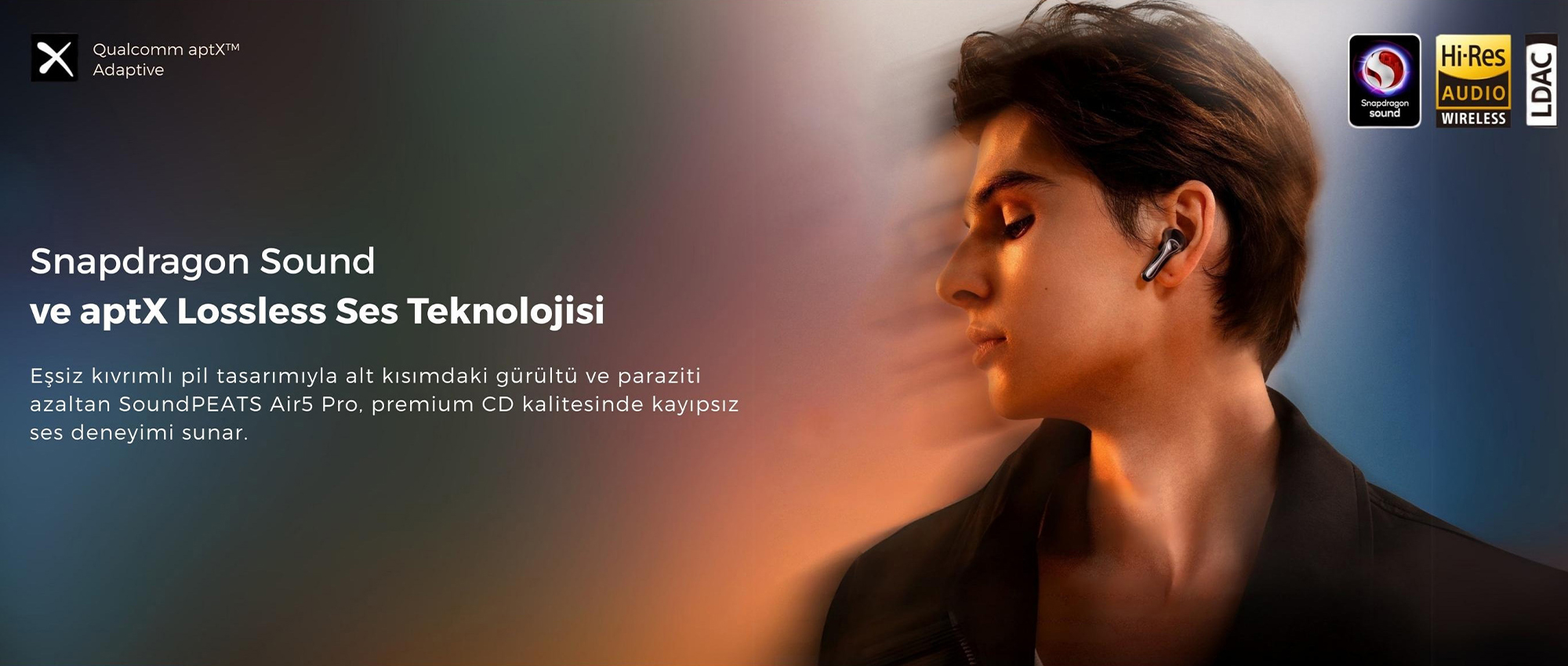 SOUNDPEATS Air5 Pro, Snapdragon Sound™ destekli Qualcomm® QCC3091 yonga seti, aptX Lossless ve LDAC codec’leri ile kablosuz kulaklıklarda ses kalitesini yeni bir seviyeye taşıyor. Hi-Res Audio Wireless sertifikası sayesinde müziği stüdyo kalitesine en yakın haliyle dinleyebilir, güçlü aktif gürültü engelleme ve düşük gecikme özellikleriyle hem eğlence hem de günlük kullanımda üstün bir deneyim yaşayabilirsiniz.