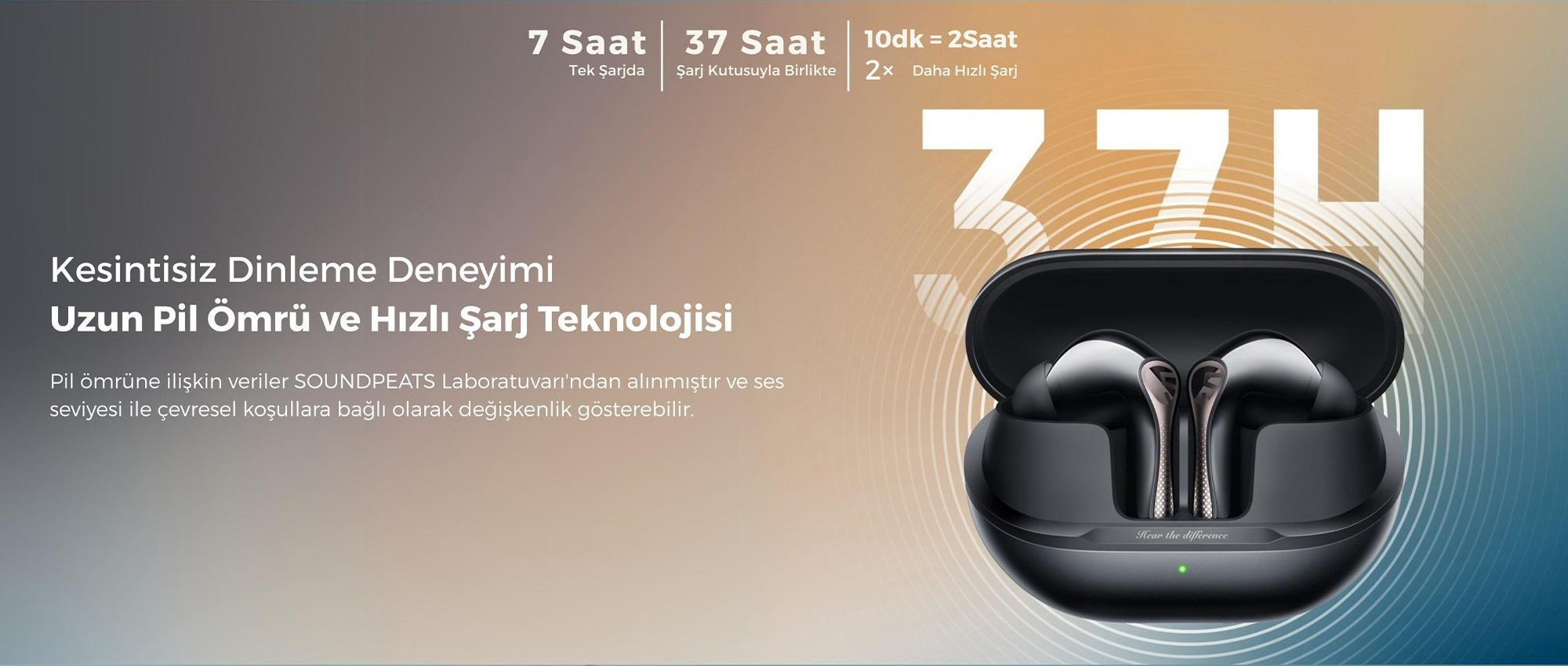 Kulaklıklar tek şarjla ANC kapalıyken yaklaşık 7.5 saate kadar kesintisiz kullanım sunar. Şarj kutusu ile birlikte toplamda 37 saate kadar çalma süresi elde edilebilir.