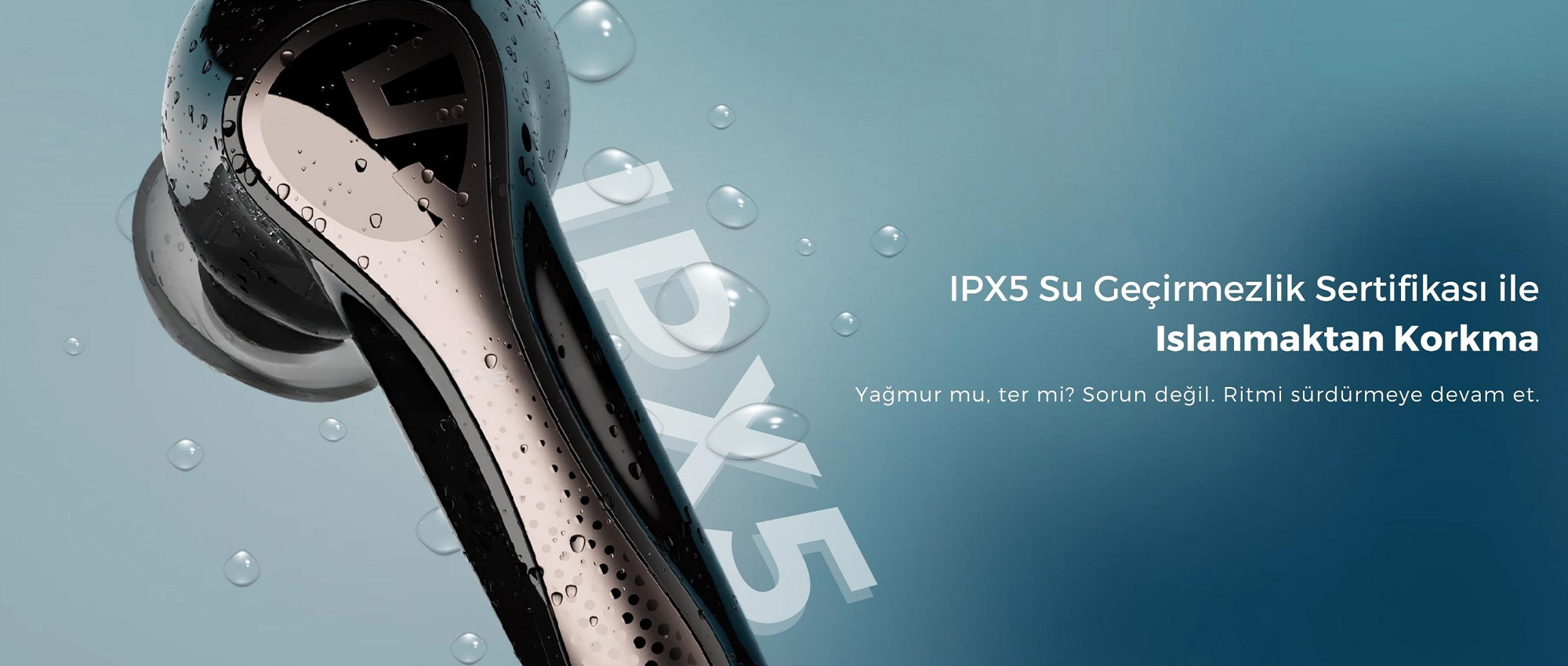 Evet. IPX5 sertifikası sayesinde terlemeye ve su sıçramalarına karşı dayanıklıdır. Spor ve günlük dış mekân kullanımı için uygundur.
