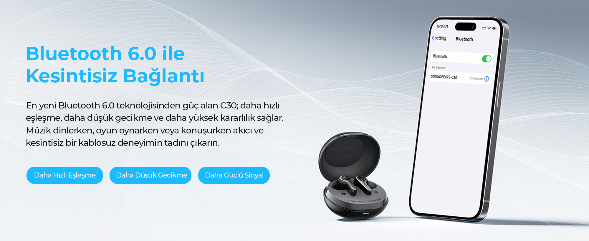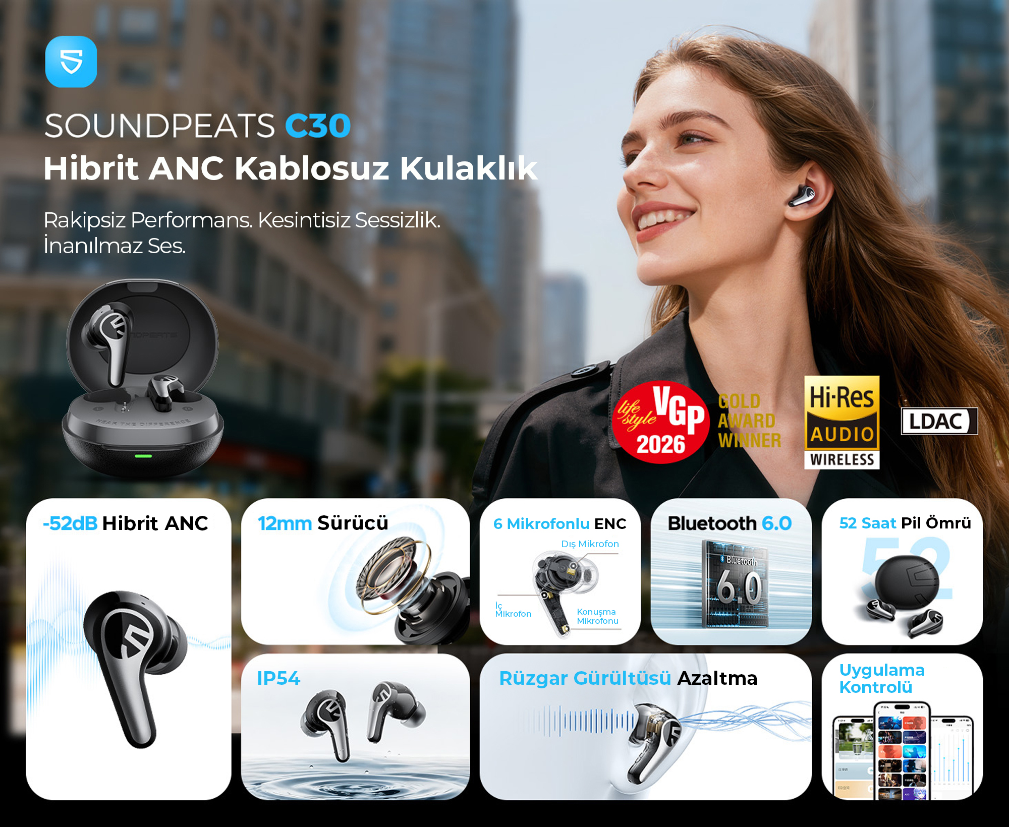 SoundPEATS C30, dünyanın ilk Bluetooth 6.0 teknolojisine sahip kulaklıklarından biri olarak bağlantı kararlılığı ve enerji verimliliğinde kuralları yeniden yazıyor. Bluetrum BT8972H yonga setinden aldığı güçle, sadece müzik dinlemenizi değil, müziği hissetmenizi sağlar. Şehrin kaosuna bir mola verin. Pazar standartlarının çok ötesindeki 52dB Hibrit Aktif Gürültü Engelleme (ANC) teknolojisi, Şehir uğultusundan ofis gürültüsüne kadar tüm dikkat dağıtıcı sesleri %92 oranında yok ederek size özel bir sessizlik alanı yaratır. Hi-Res Audio sertifikalı LDAC kodek desteği ve 12mm titanyum sürücüleri sayesinde, stüdyo kalitesindeki ses deneyimini bütçenizi sarsmadan yaşayın.