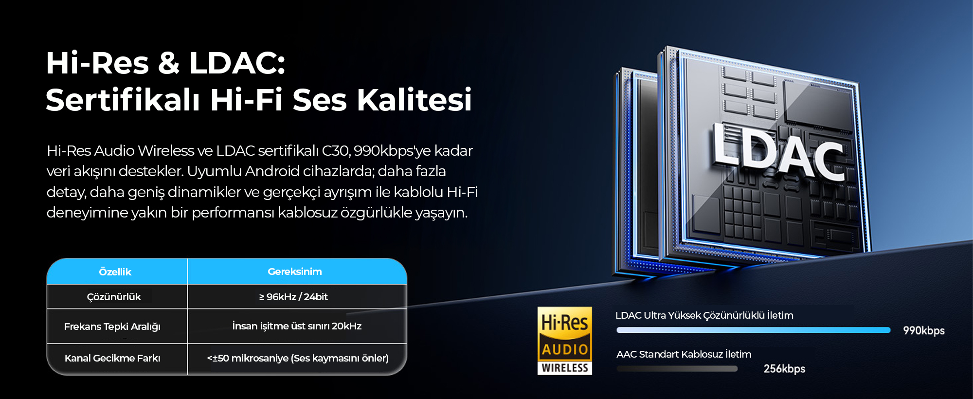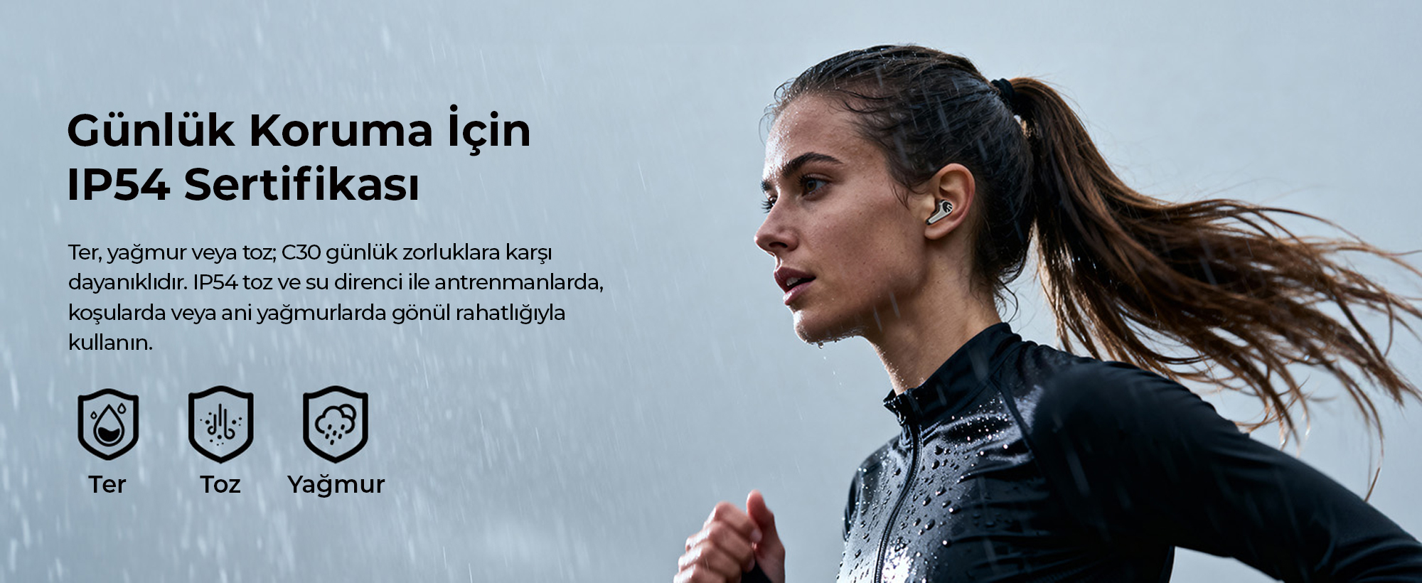 En yeni Bluetrum BT8972H işlemci ile donatılan C30, veri aktarım hızını ve kapsama alanını maksimize ederek kablosuz bağlantı standartlarını yeniden belirliyor. Sinyal yoğunluğunun yüksek olduğu alışveris merkezi veya metro gibi alanlarda bile kopma yaşatmayan bu teknoloji, ultra düşük güç tüketimiyle pil verimliliğini zirveye taşır.