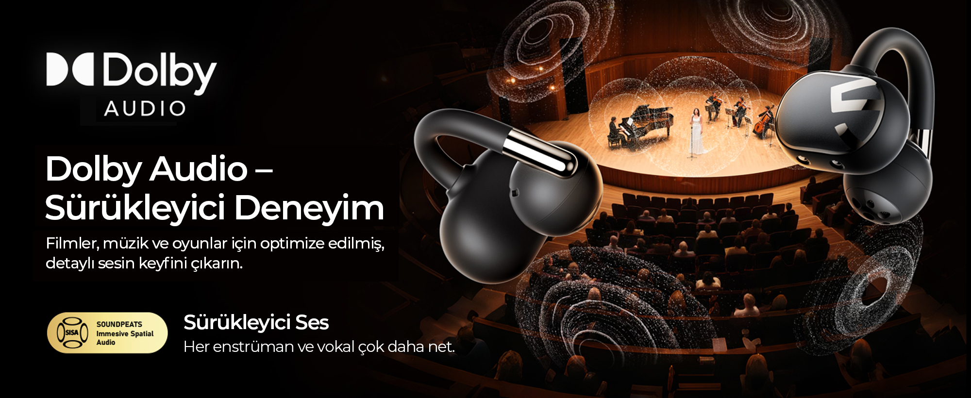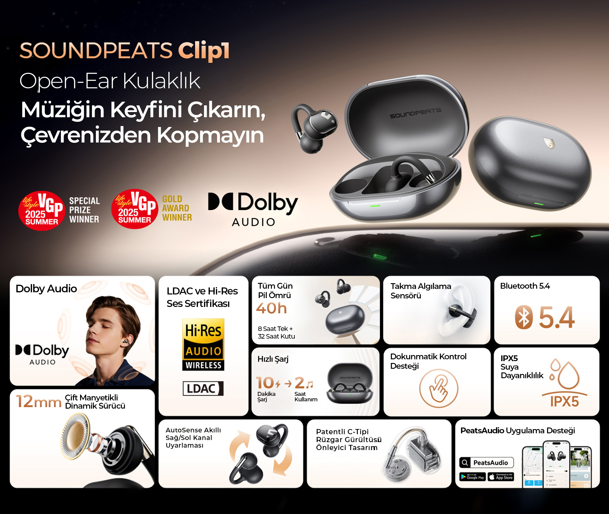 Soundpeats Clip1, Open-Ear (Açık Kulak) tasarımıyla, müziğin keyfini çıkarırken çevrenizle bağlantıda kalmanızı sağlar. Havacılık sınıfı 0.6mm Nikel-Titanyum hafızalı alaşımdan üretilen N-Flex Arch köprüsü ve tüy kadar hafif (5 gram) yapısıyla, gün boyu kulağınızda olduğunu bile unutacaksınız. Sıradan açık kulaklıkların aksine ses kalitesinden ödün vermez. Hi-Res Audio Wireless sertifikalı LDAC kodek desteği ve 12mm çift manyetik dinamik sürücüleri sayesinde, açık tasarıma rağmen stüdyo kalitesinde detay ve güçlü baslar sunar. AutoSense™ teknolojisi ile sağ-sol ayrımını ortadan kaldıran Clip1, teknoloji ve konforun mükemmel uyumudur.