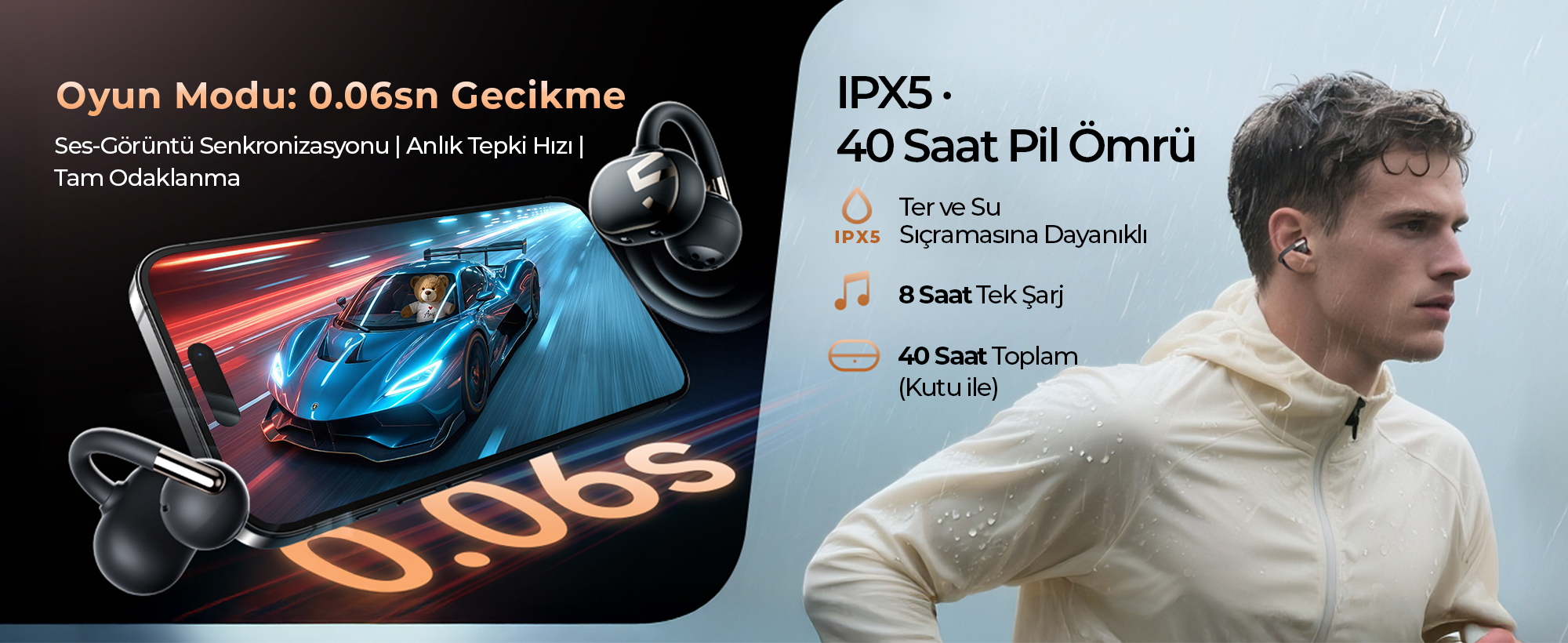 Kulak kanalını tıkamayan tasarımı sayesinde müzik dinlerken trafik seslerini, ofis konuşmalarını veya anonsları duyabilirsiniz. IPX5 sertifikası ile tere ve yağmura karşı dayanıklıdır, spor aktivitelerinizde güvenle size eşlik eder.