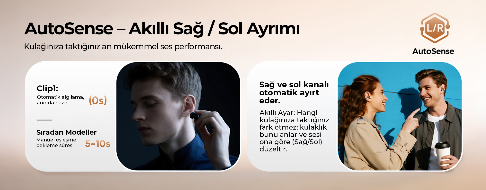 Sağ veya sol kulaklık arama derdine son. Kulaklıkları rastgele kulağınıza takın; dahili sensörler duruş açısını algılayarak ses kanallarını (Stereo Sağ/Sol) saniyeler içinde otomatik olarak ayarlar.