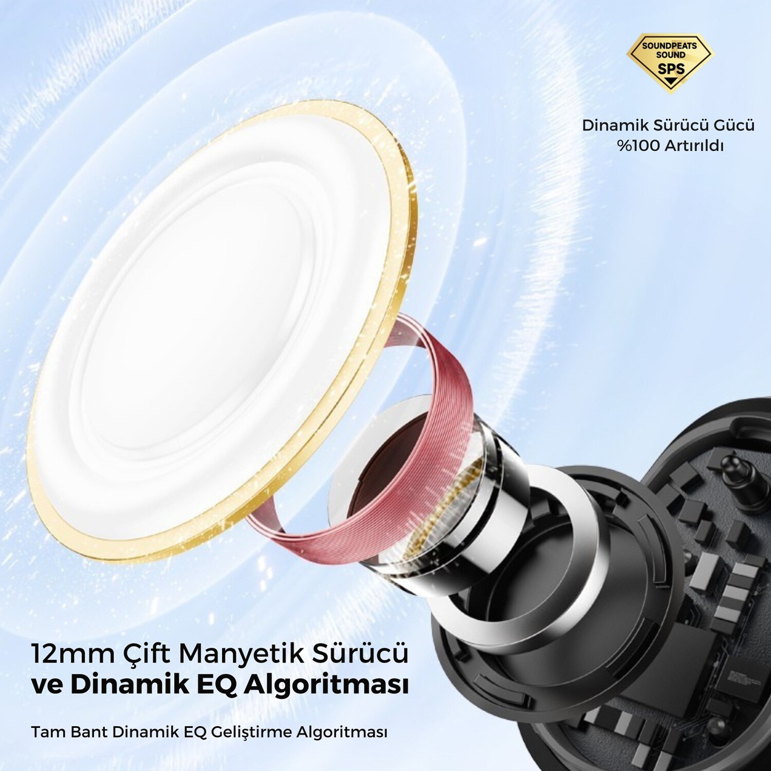 PearlClip Pro, 12mm Dual-Magnet (çift mıknatıslı) dinamik sürücüler ile donatılmıştır. PU + nikel kaplamalı diyafram, yüksek manyetik kuvvet sağlayarak net tizler, dengeli midler ve güçlü bas performansı sunar. Dynamic EQ algoritması, bas frekanslarını otomatik olarak optimize ederek açık kulak tasarımına rağmen etkileyici bir ses deneyimi oluşturur.