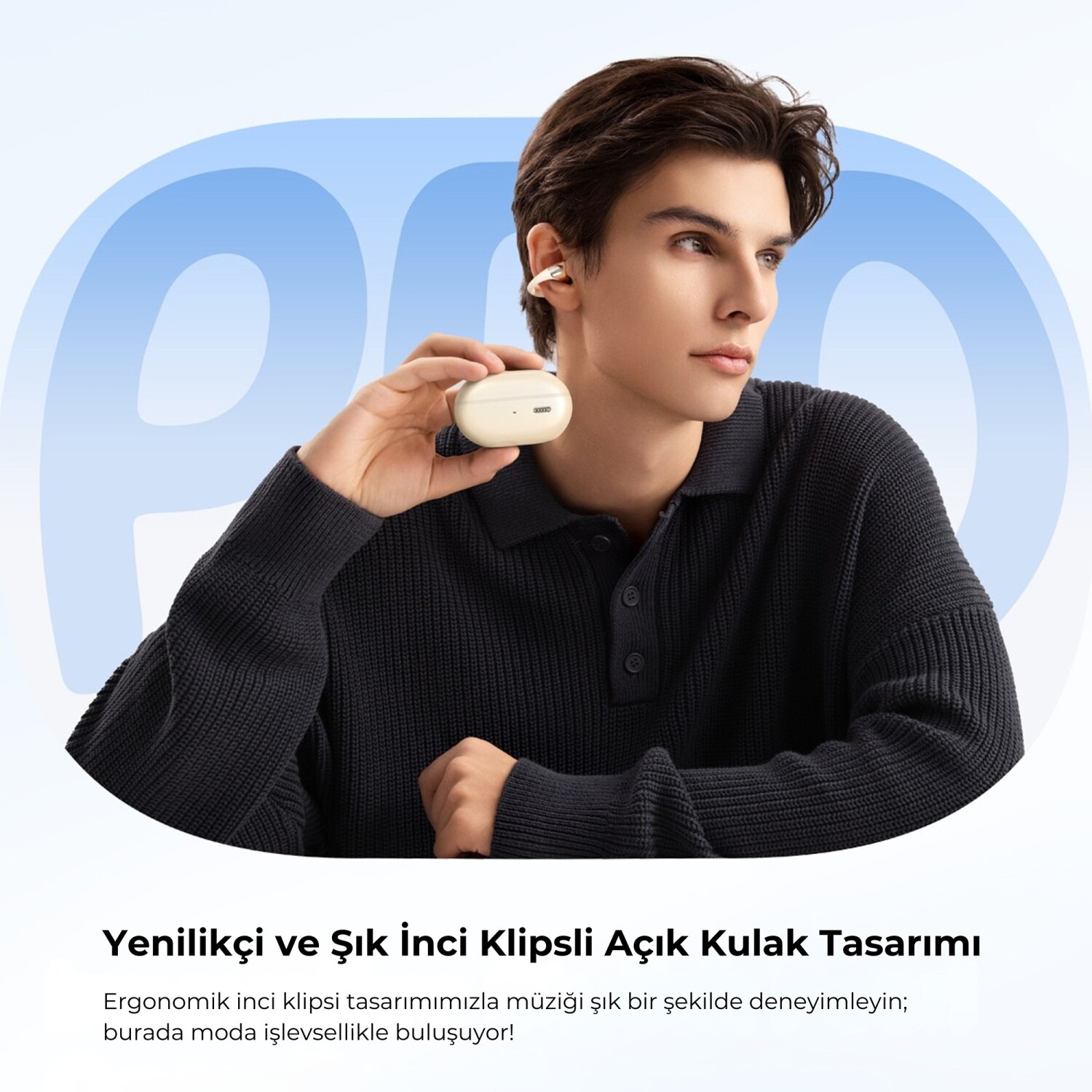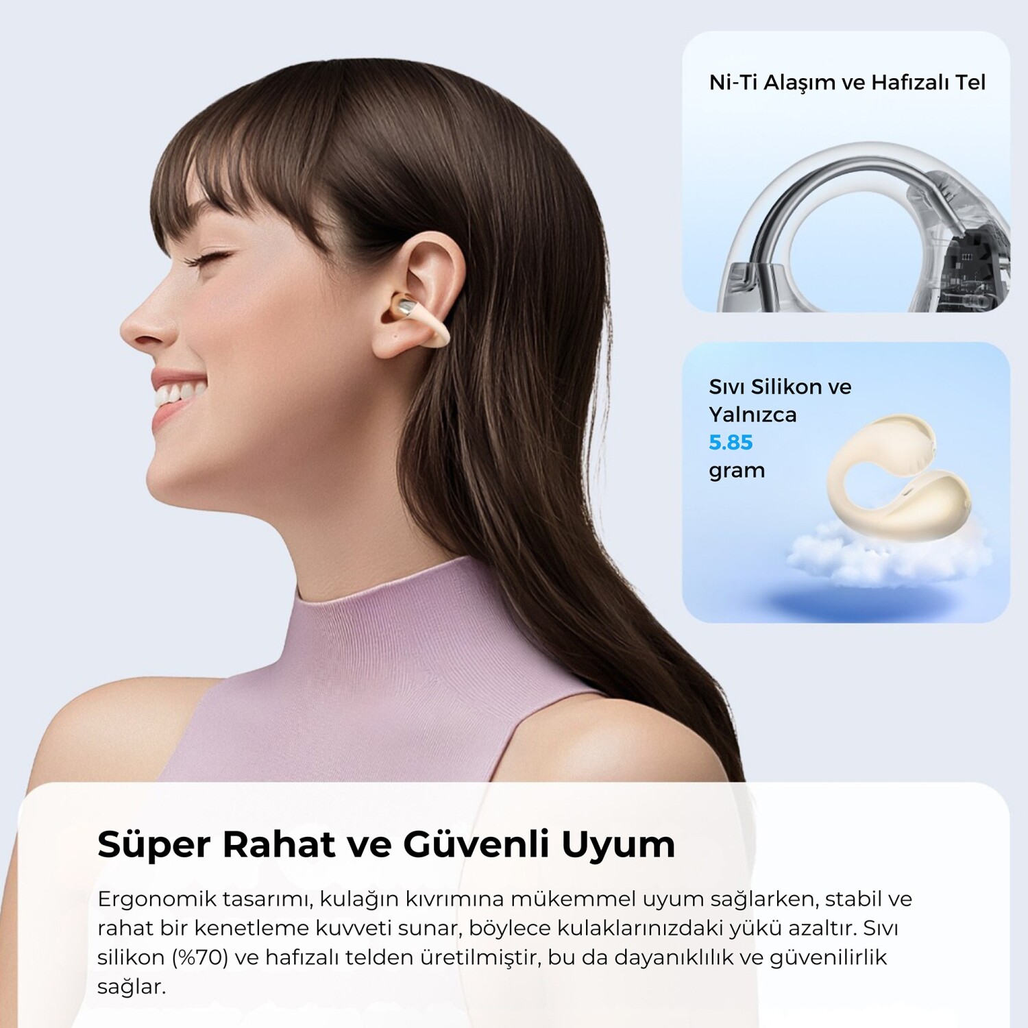 Her bir kulaklık yalnızca 5.85 gram ağırlığındadır. Ergonomik open-ear clip-on yapısı, kulak kanalını kapatmadan güvenli ve sabit bir tutuş sağlar. %70 cilt dostu sıvı silikon ve nikel-titanyum hafızalı tel kullanımı sayesinde uzun süreli kullanımlarda bile baskı hissi oluşturmaz. Açık tasarım, dış ortam seslerini duymanıza imkân tanıyarak özellikle dış mekân aktivitelerinde güvenliği artırır.