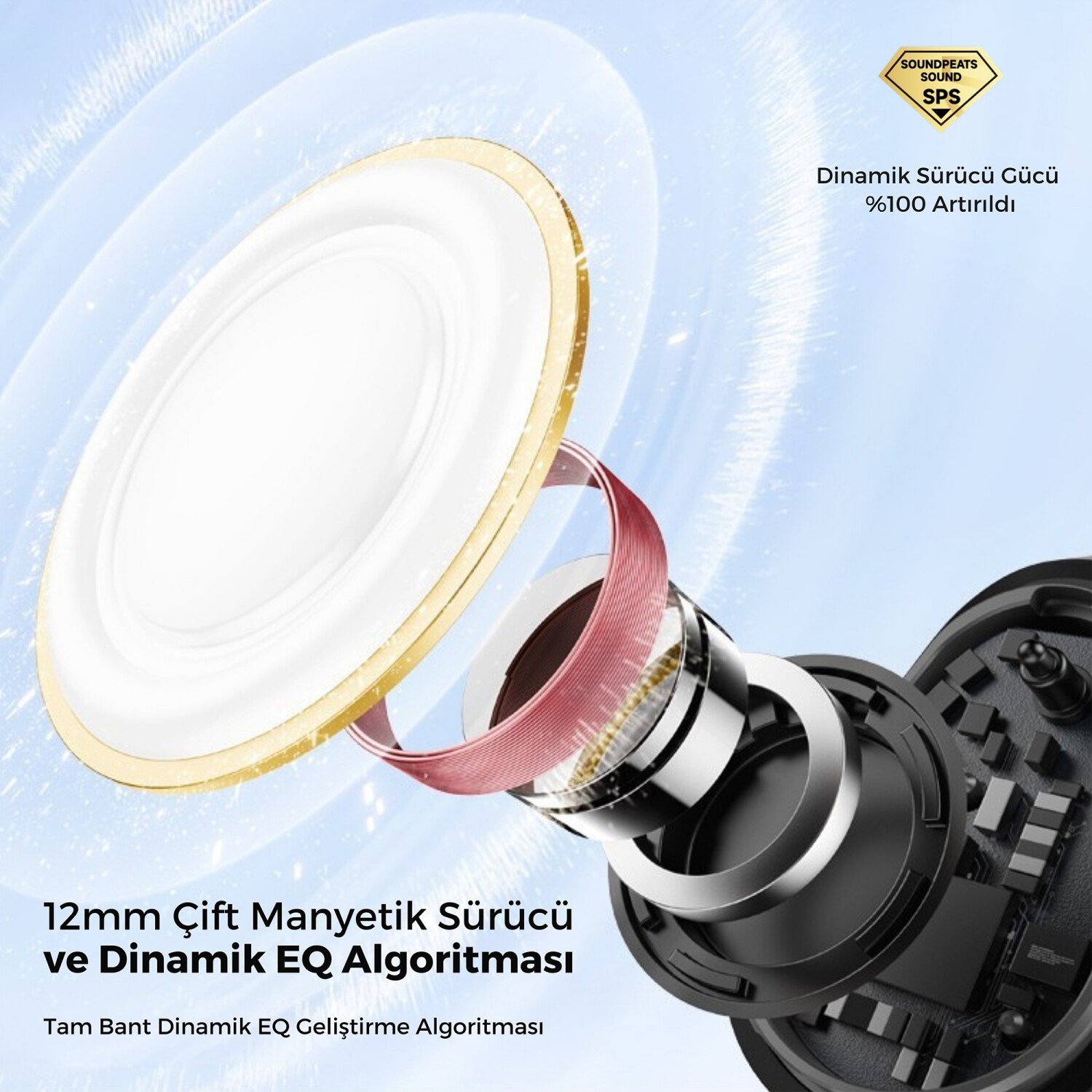 PearlClip Pro, 12mm Dual-Magnet (çift mıknatıslı) dinamik sürücüler ile donatılmıştır. PU + nikel kaplamalı diyafram, yüksek manyetik kuvvet sağlayarak net tizler, dengeli midler ve güçlü bas performansı sunar. Dynamic EQ algoritması, bas frekanslarını otomatik olarak optimize ederek açık kulak tasarımına rağmen etkileyici bir ses deneyimi oluşturur.