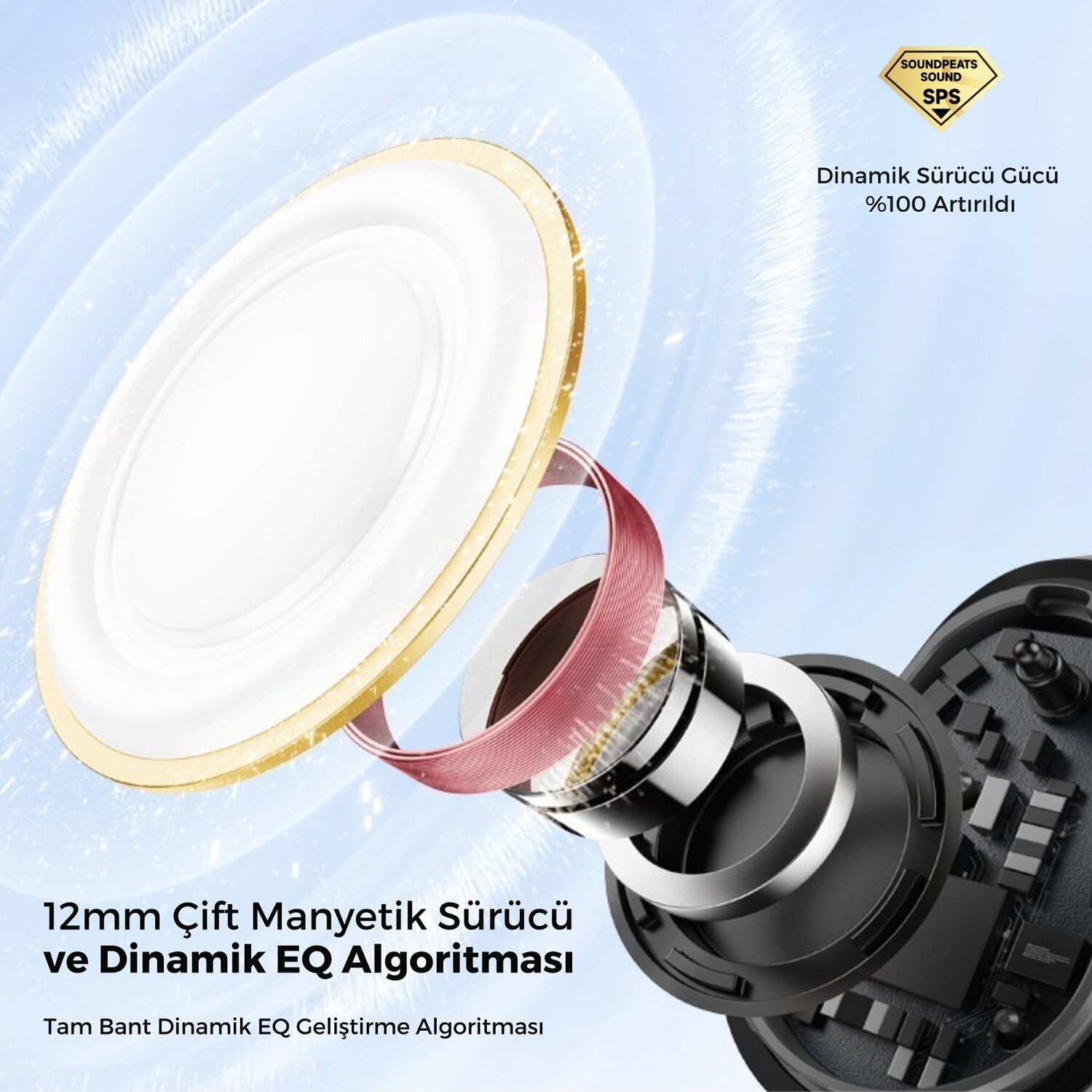 PearlClip Pro, 12mm Dual-Magnet (çift mıknatıslı) dinamik sürücüler ile donatılmıştır. PU + nikel kaplamalı diyafram, yüksek manyetik kuvvet sağlayarak net tizler, dengeli midler ve güçlü bas performansı sunar. Dynamic EQ algoritması, bas frekanslarını otomatik olarak optimize ederek açık kulak tasarımına rağmen etkileyici bir ses deneyimi oluşturur.