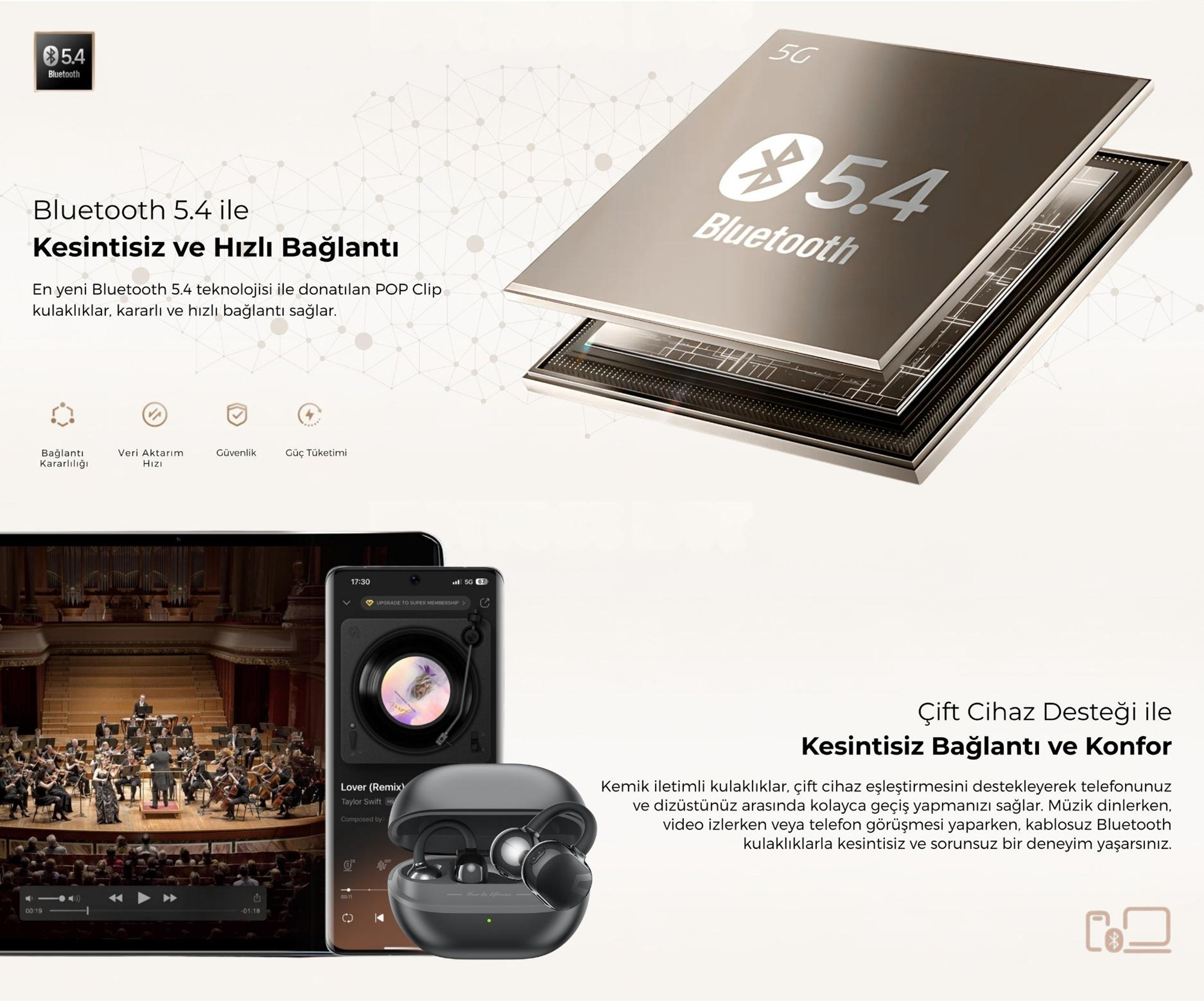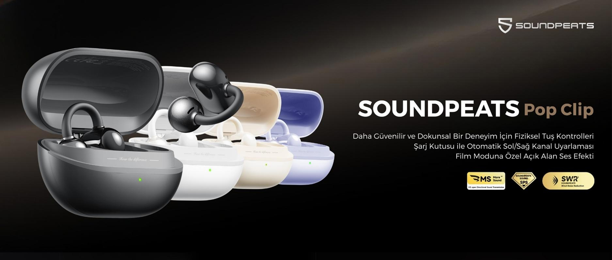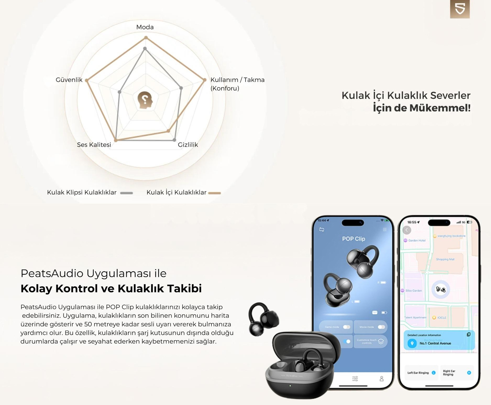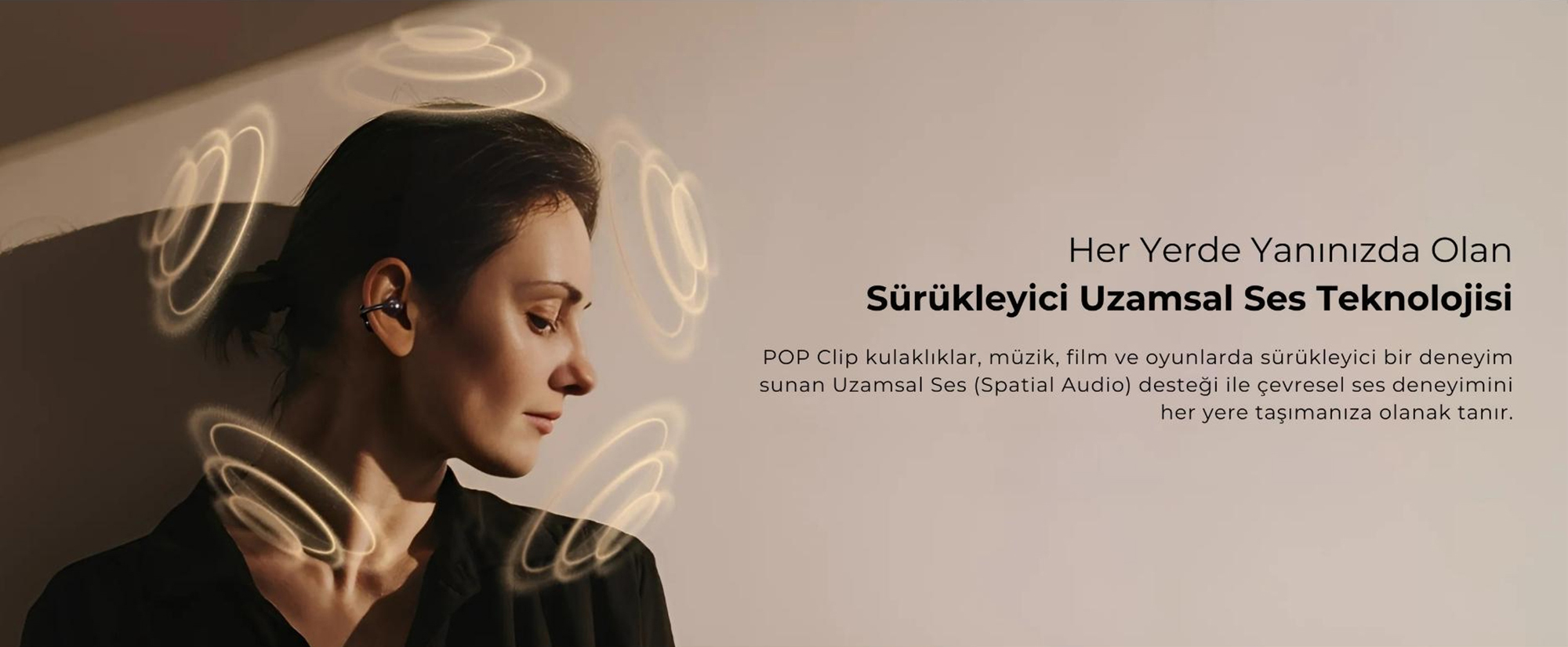 SOUNDPEATS POP Clip, modern open-ear clip-on tasarımı, güçlü sürücü yapısı ve akıllı uygulama özellikleriyle günlük kullanım ve aktif yaşam için geliştirilmiş yenilikçi bir kablosuz kulaklıktır. Sadece 4.73 gram ağırlığındaki ultra hafif yapısı, fiziksel tuş kontrolü ve uzun pil ömrüyle konfor, güvenlik ve performansı aynı anda sunar.