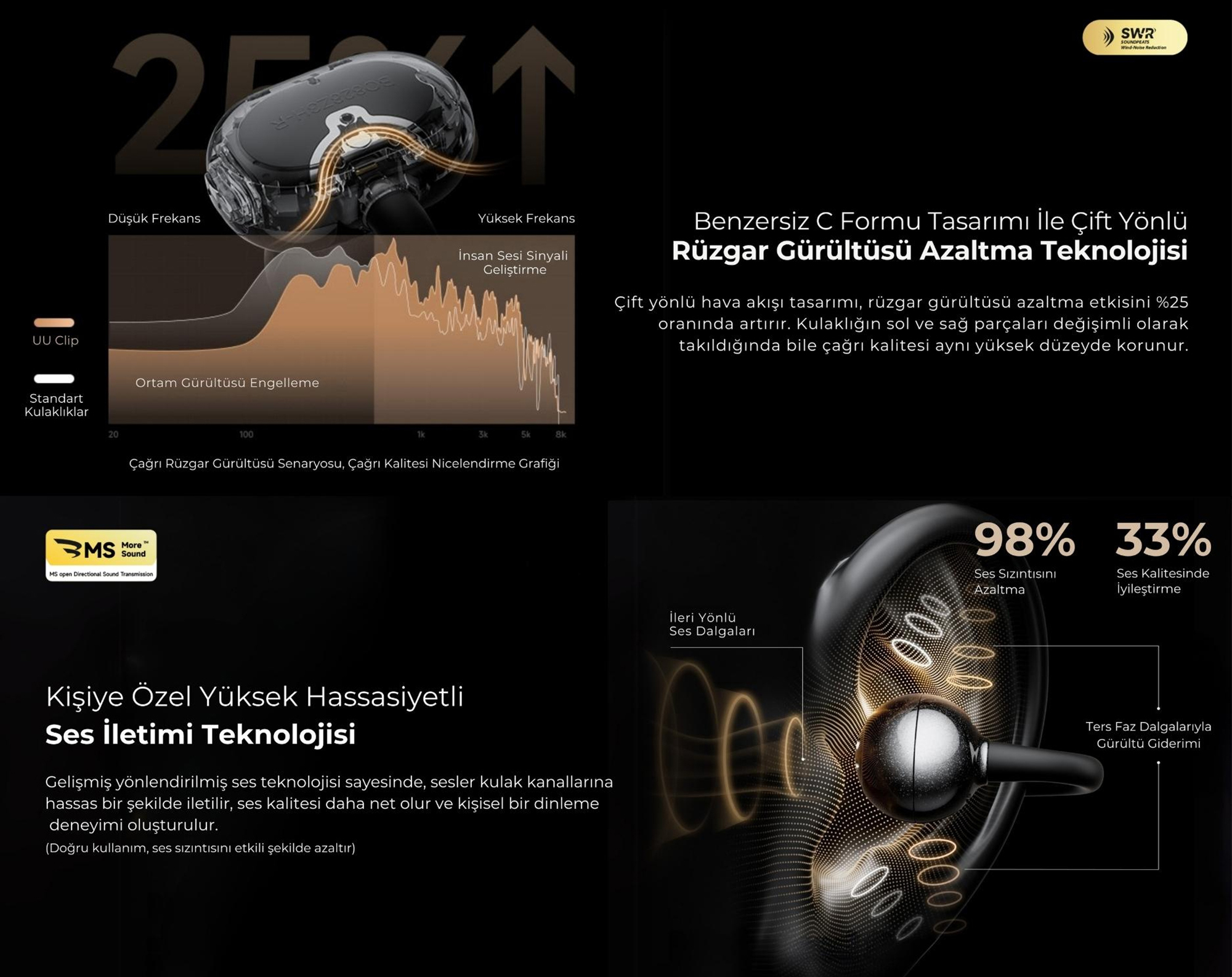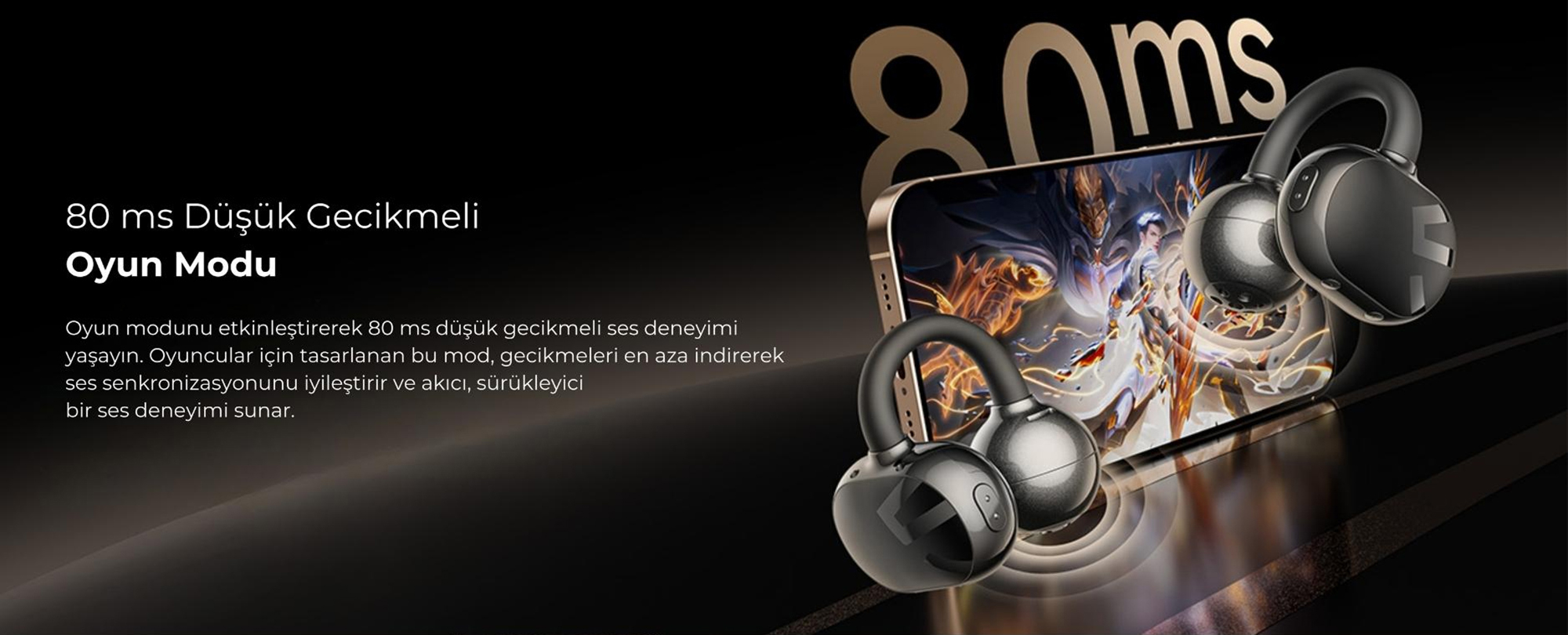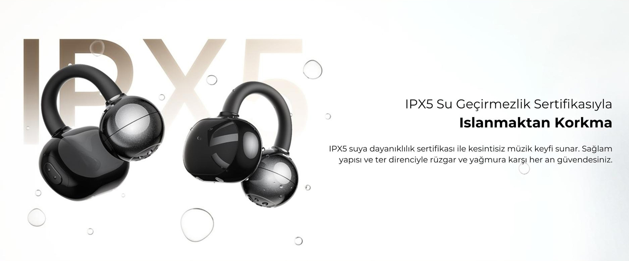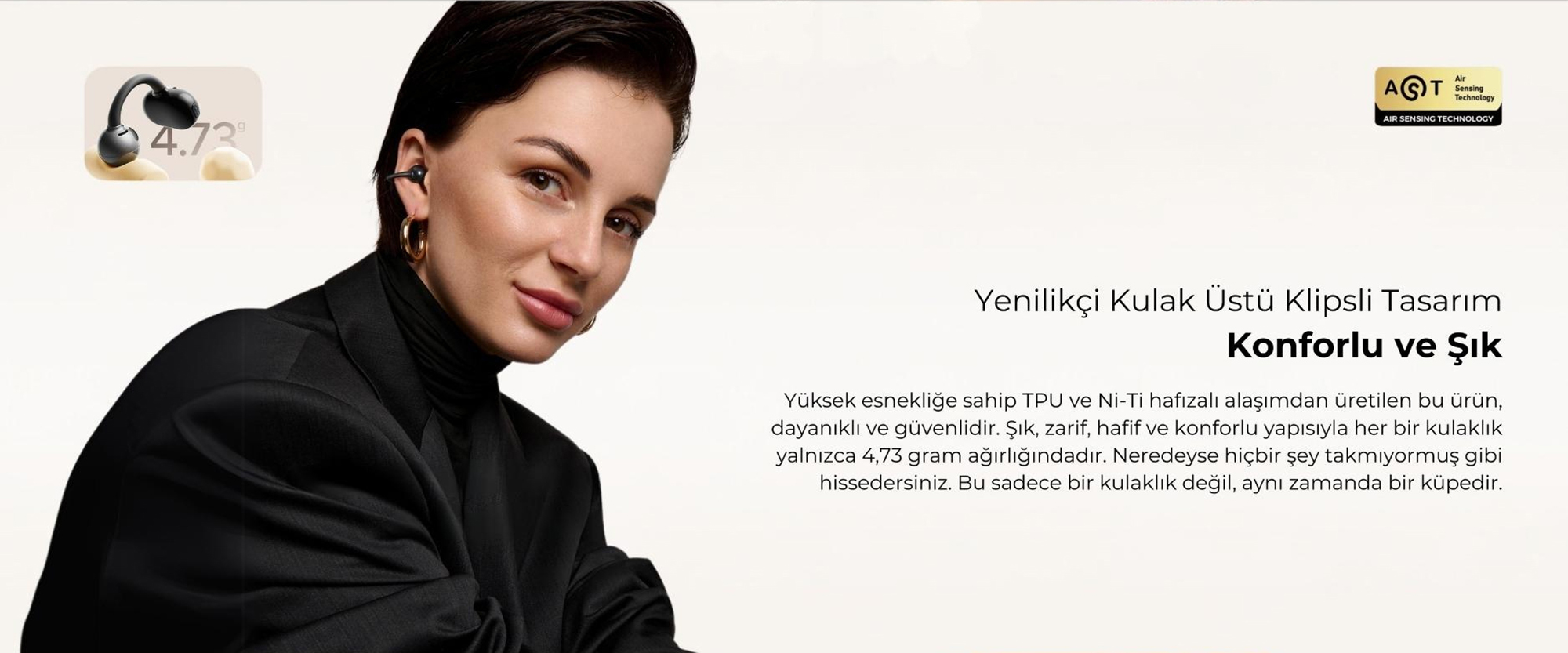 Her bir kulaklık yalnızca 4.73g ağırlığındadır. Yüksek kaliteli TPU malzeme ve nikel-titanyum hafızalı tel ile üretilen clip-on yapı, farklı kulak şekillerine güvenli şekilde uyum sağlar. Açık kulak tasarımı sayesinde kulak kanalına baskı uygulamaz, uzun süreli kullanımlarda yorgunluk hissi oluşturmaz. Terlemeye dayanıklı ve sabit duruşu sayesinde spor ve hareketli aktiviteler için uygundur.