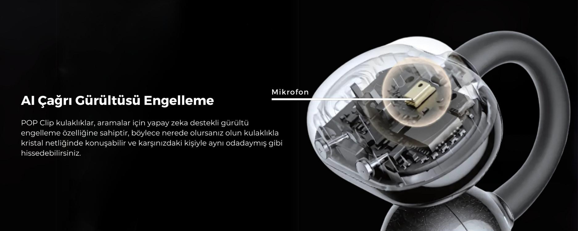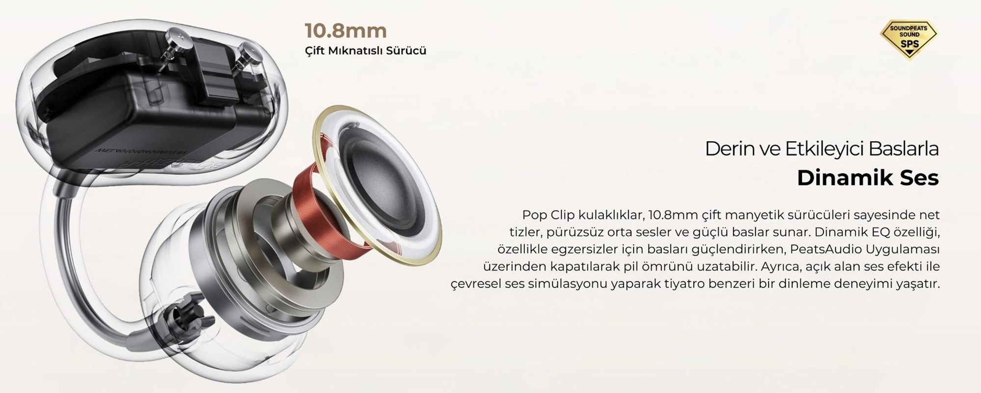 10.8mm Çift Mıknatıslı Sürücü ile Güçlü ve Dinamik SesPOP Clip, 10.8mm Dual-Magnet sürücüler ve PU + LCP kompozit diyafram yapısı ile net tizler, pürüzsüz orta frekanslar ve güçlü bas performansı sunar. Dynamic EQ teknolojisi basları otomatik olarak güçlendirerek özellikle spor ve hareket sırasında daha enerjik bir dinleme deneyimi sağlar. İstendiğinde Dynamic EQ, PeatsAudio uygulaması üzerinden kapatılarak pil tasarrufu sağlanabilir.