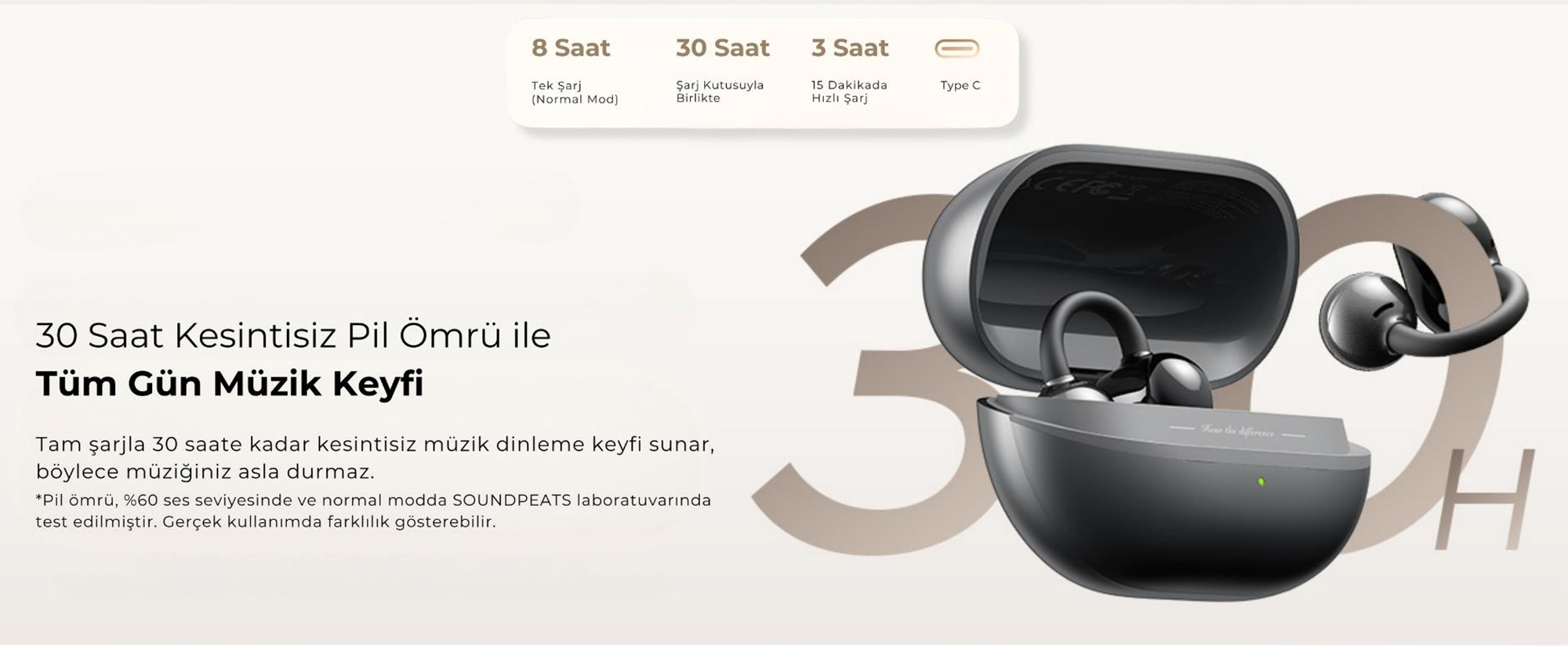 15 dakikalık hızlı şarj, yaklaşık 3 saatlik kullanım süresi sunar. Toplamda 30 saate kadar pil ömrü sağlar.