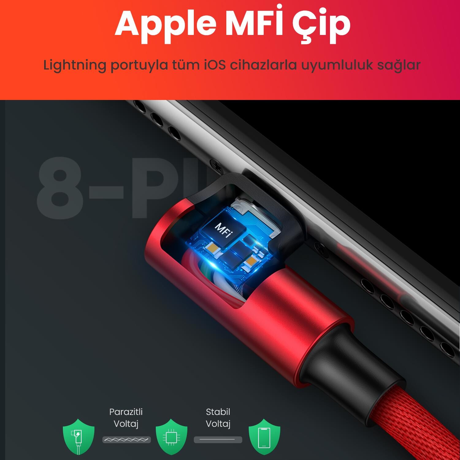 1 x Ugreen 90 Derece Açılı Lightning iPhone Şarj ve Data Kablosu Kırmızı 1 Metre