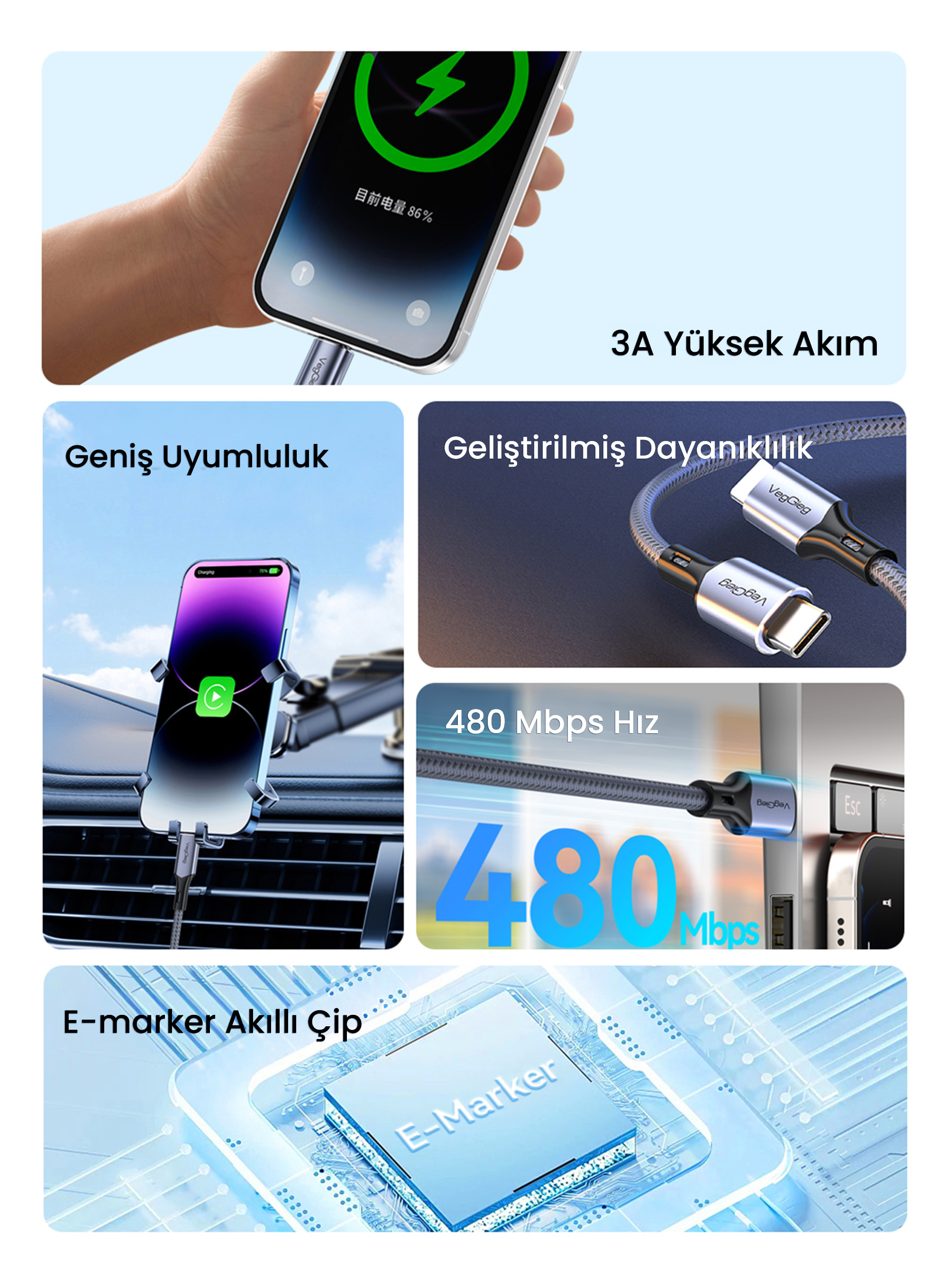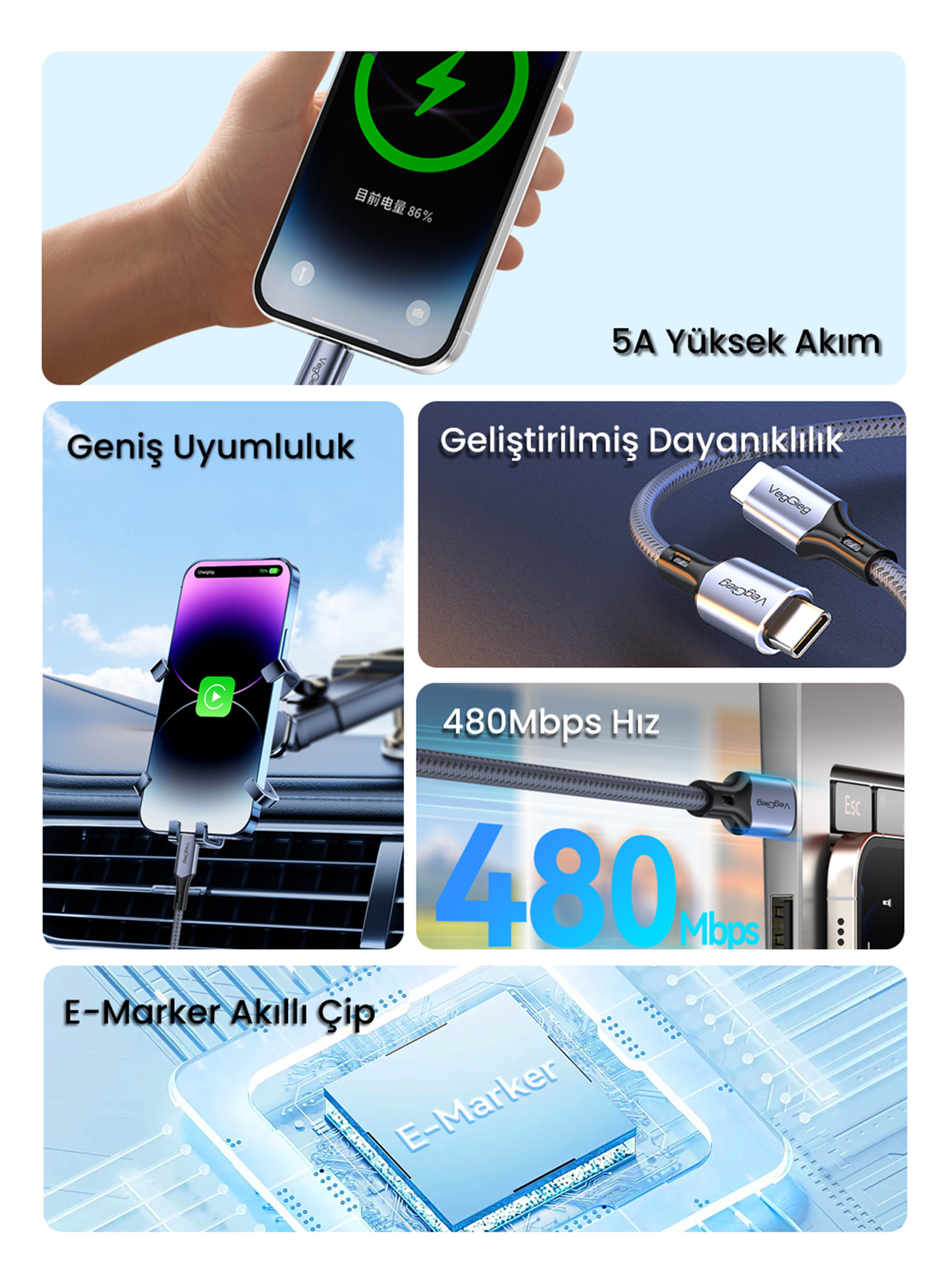 100W'a kadar çıkış gücüne ve 5A akım desteğine sahip bu şarj ve data kablosu, cihazlarınızı en kısa sürede şarj eder. Özellikle dizüstü bilgisayarlar, tabletler ve hızlı şarj destekli akıllı telefonlar için mükemmel bir çözümdür.