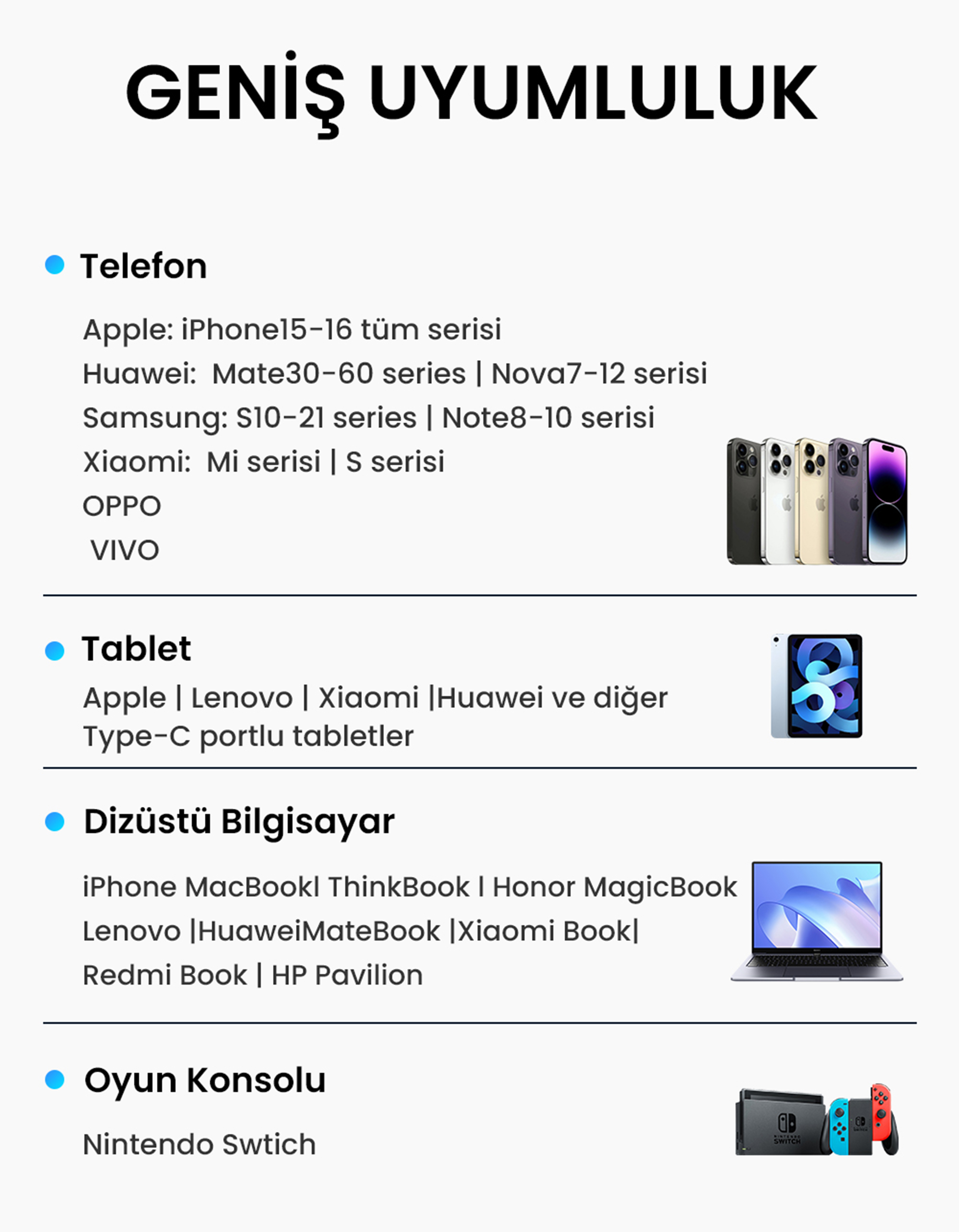 Cevap: Evet, kablomuz tüm USB-C girişine sahip cihazlarla uyumludur ve PD hızlı şarj desteği olan cihazlarda maksimum performans sağlar.