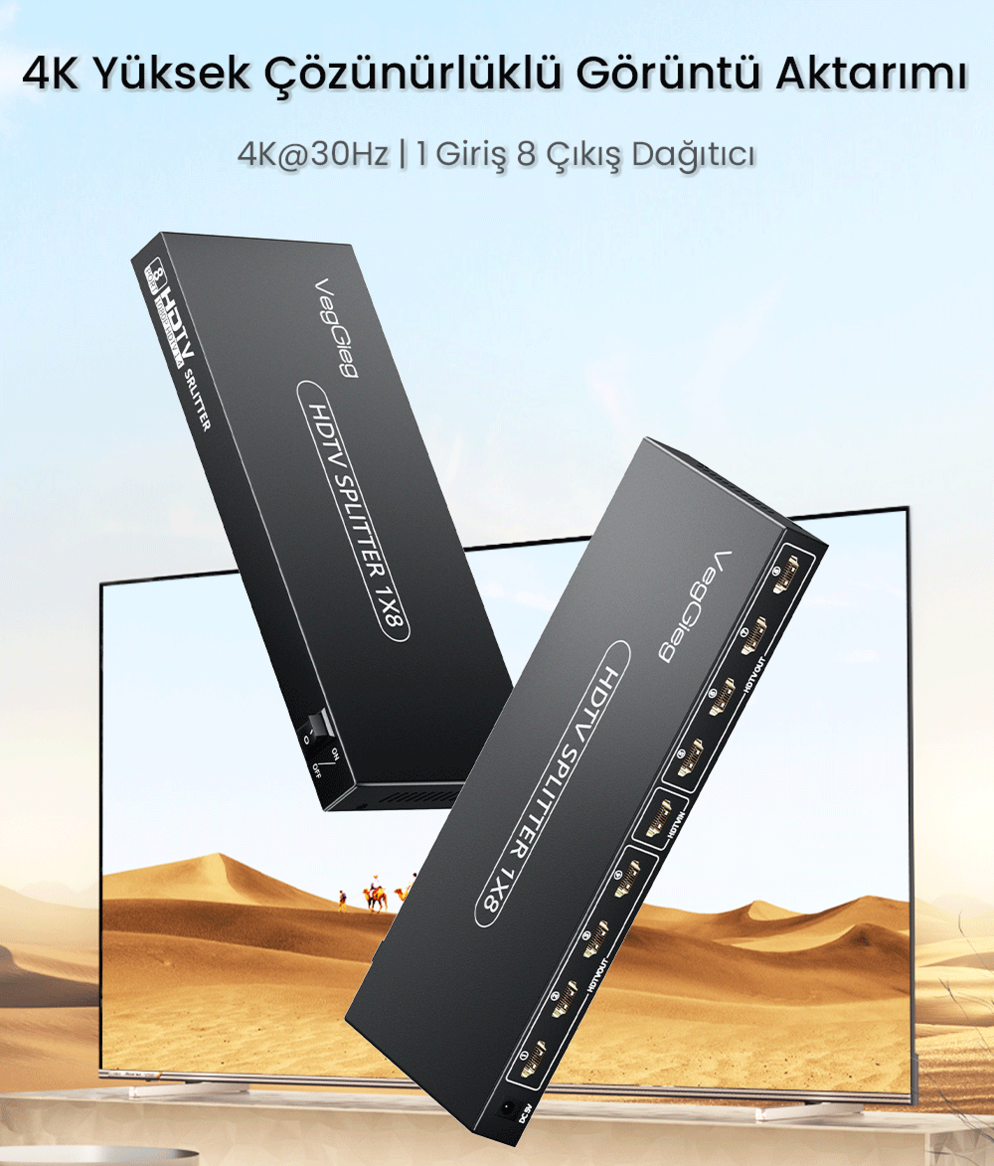 Çıkış (Output) portu bulunur. Sisteme bağladığınız ana kaynağın görüntüsünü tam 8 farklı televizyona, monitöre veya projeksiyona anında kopyalar. Cihazlar arasında geçiş yapmaya veya kablo sök-tak işlemine gerek kalmadan tüm ekranlarda eşzamanlı ve akıcı bir yayın elde edersiniz.Yüksek Çözünürlük: 4K/30Hz, 1080P ve 3D Desteği