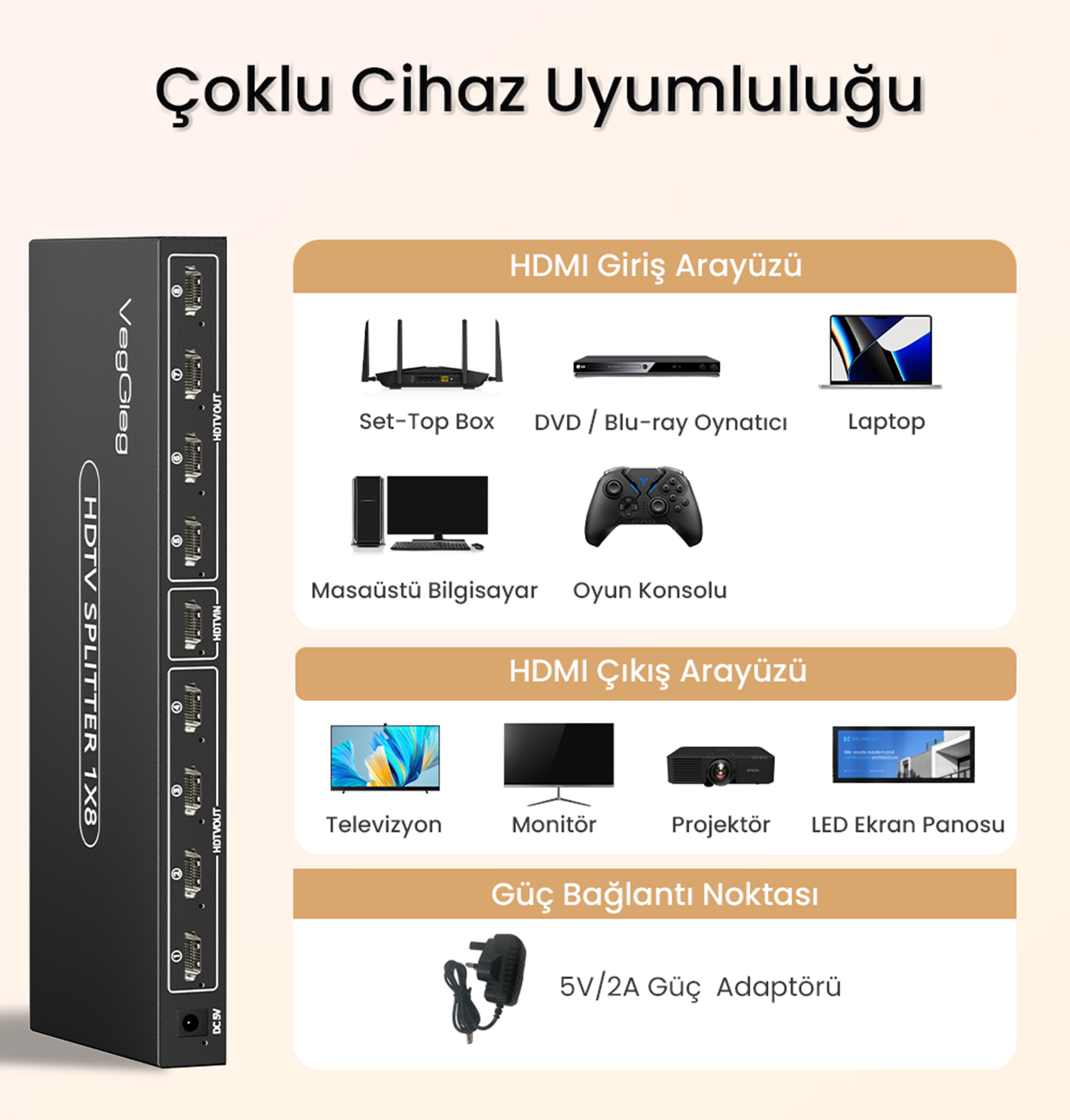 1 x VegGieg 8 Port HDMI Splitter Cihazı