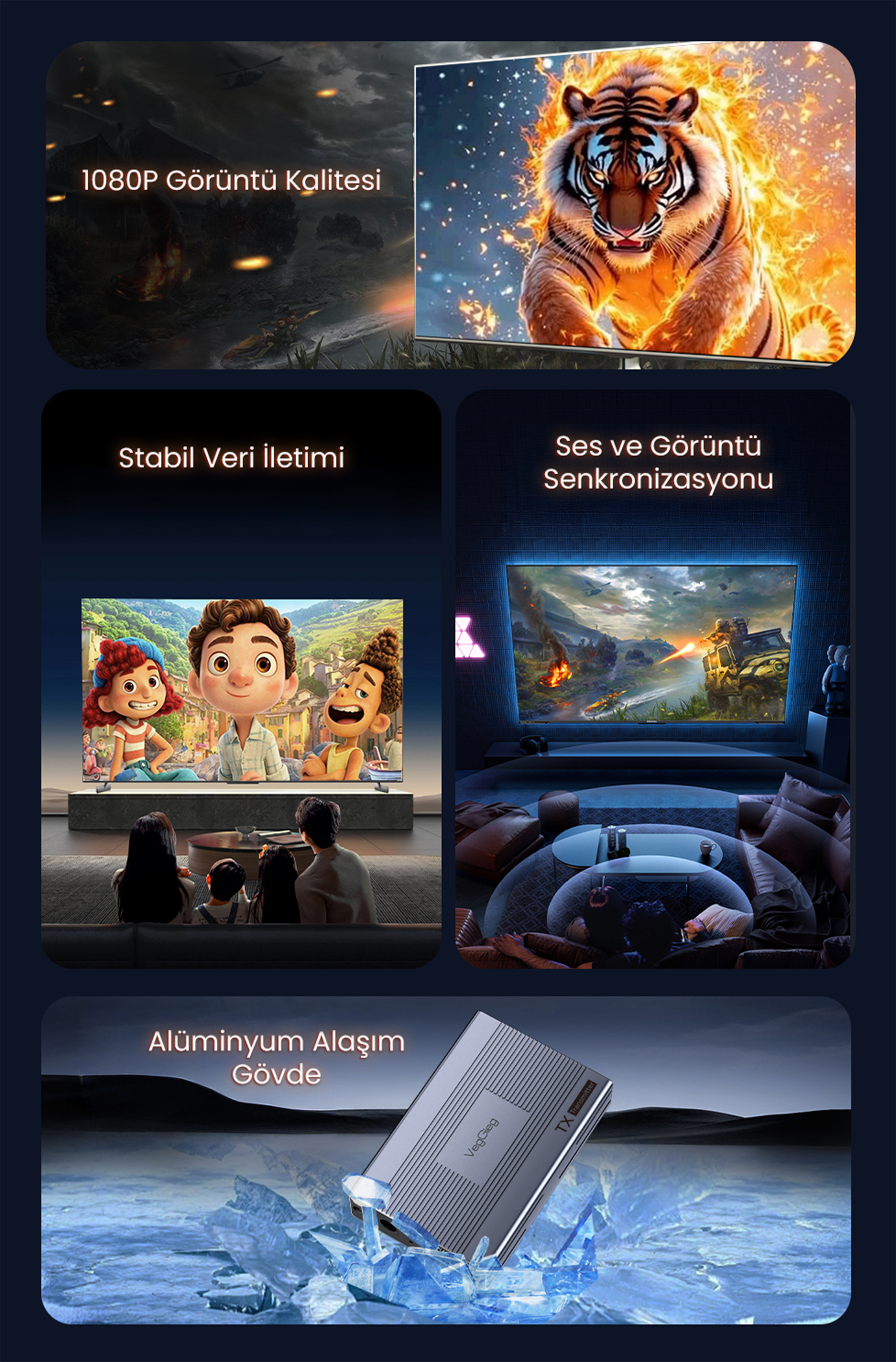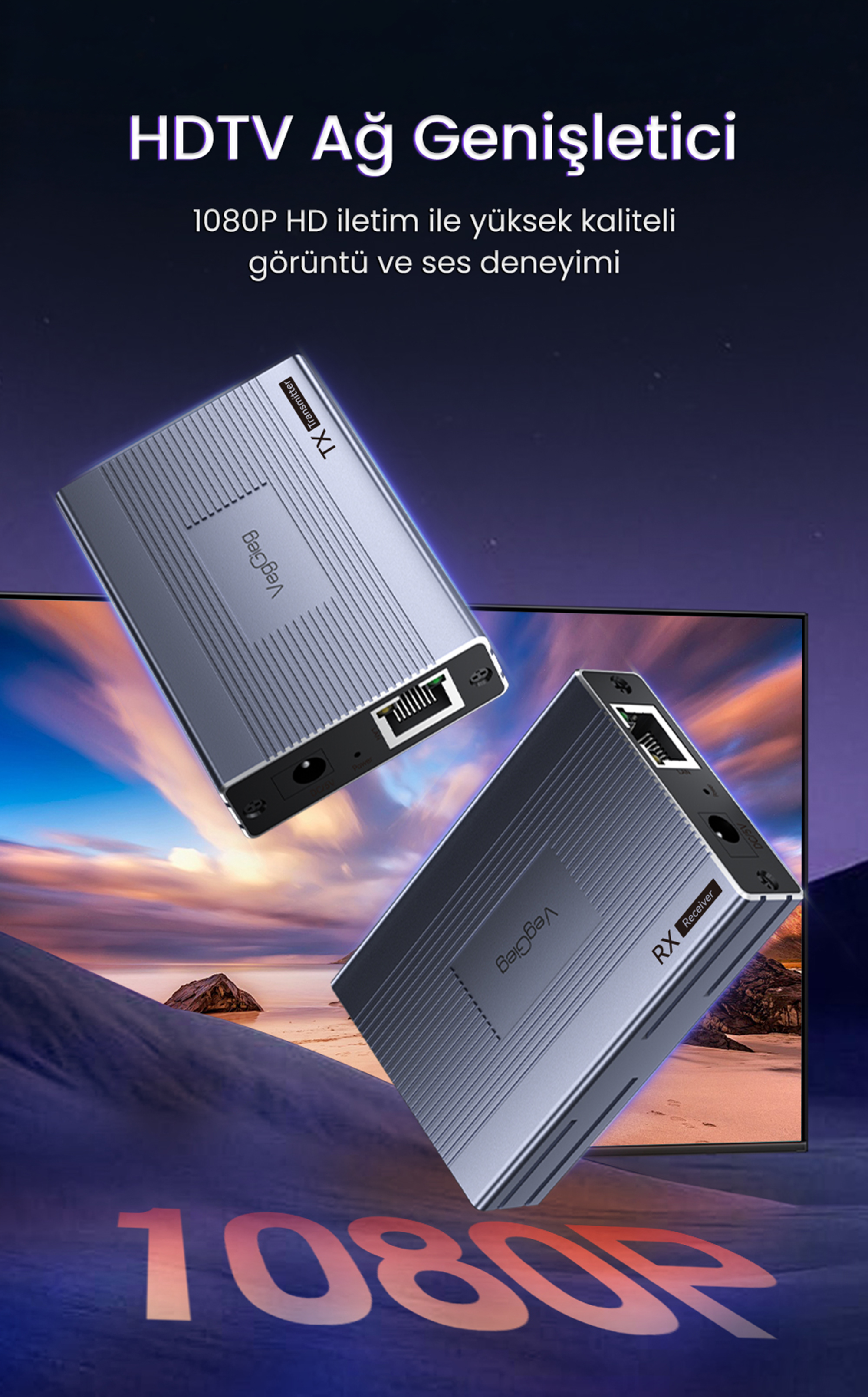 VegGieg 1080P Full HD 60Hz HDMI Extender CAT5E/6 Klavye Mouse HDMI Menzil Genişletici Uzatıcı, HDMI kablolarının mesafe sınırını aşmak için geliştirilmiş ticari sınıf bir görüntü ve ses uzatma çözümüdür. HDMI sinyallerini standart ağ kabloları üzerinden 120 metre kayıpsız şekilde ileterek yüksek çözünürlüklü görüntü aktarımı sağlar. Özellikle uzun mesafeli projelerde yüksek performans ve stabil sinyal iletimi sunar. Yerleşik EDID yönetimi, HDCP 1.2 uyumluluğu ve IR uzaktan kumanda desteği sayesinde maksimum cihaz uyumluluğu sağlar. Güvenilir yapısı ile kurumsal ve profesyonel kullanımlar için ideal bir çözümdür.