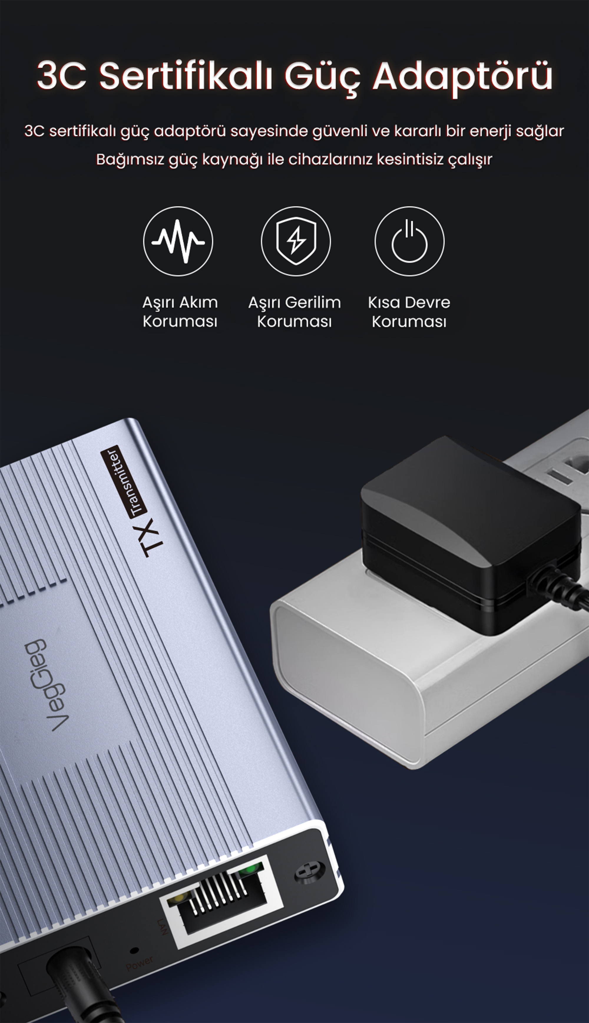 Tak ve çalıştır yapısı sayesinde kurulum son derece pratiktir. Gönderici ve alıcı üniteler 5V adaptör ile çalışır. Ethernet kablosu bağlantısı yapıldıktan sonra cihaz otomatik olarak çalışmaya başlar ve sinyal ışıkları ile durum bilgisi sunar. Ek yazılım veya teknik ayar gerektirmez.