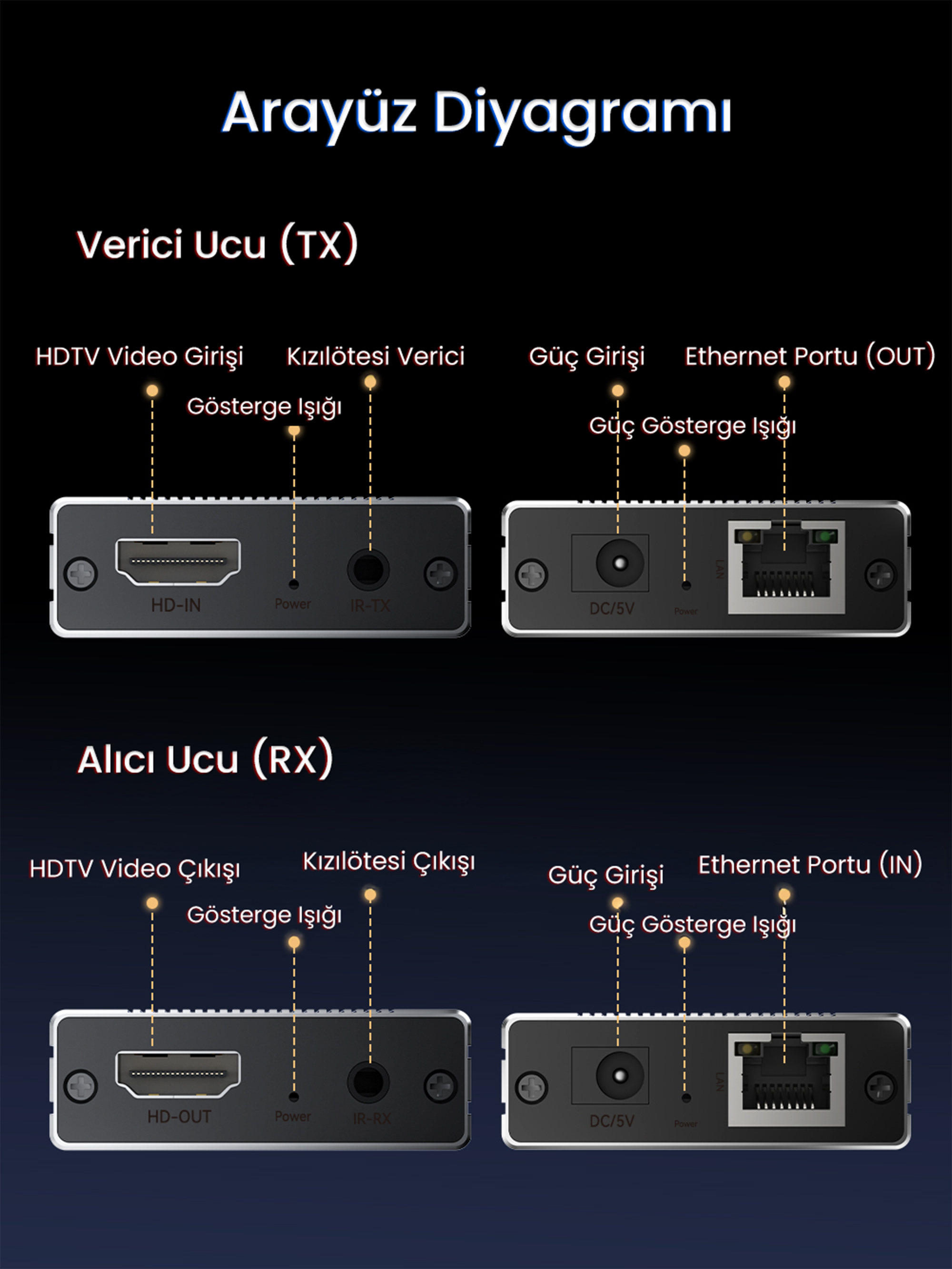 4. TX ve RX cihazlarını CAT5e veya CAT6 Ethernet kablosu ile birbirine bağlayın