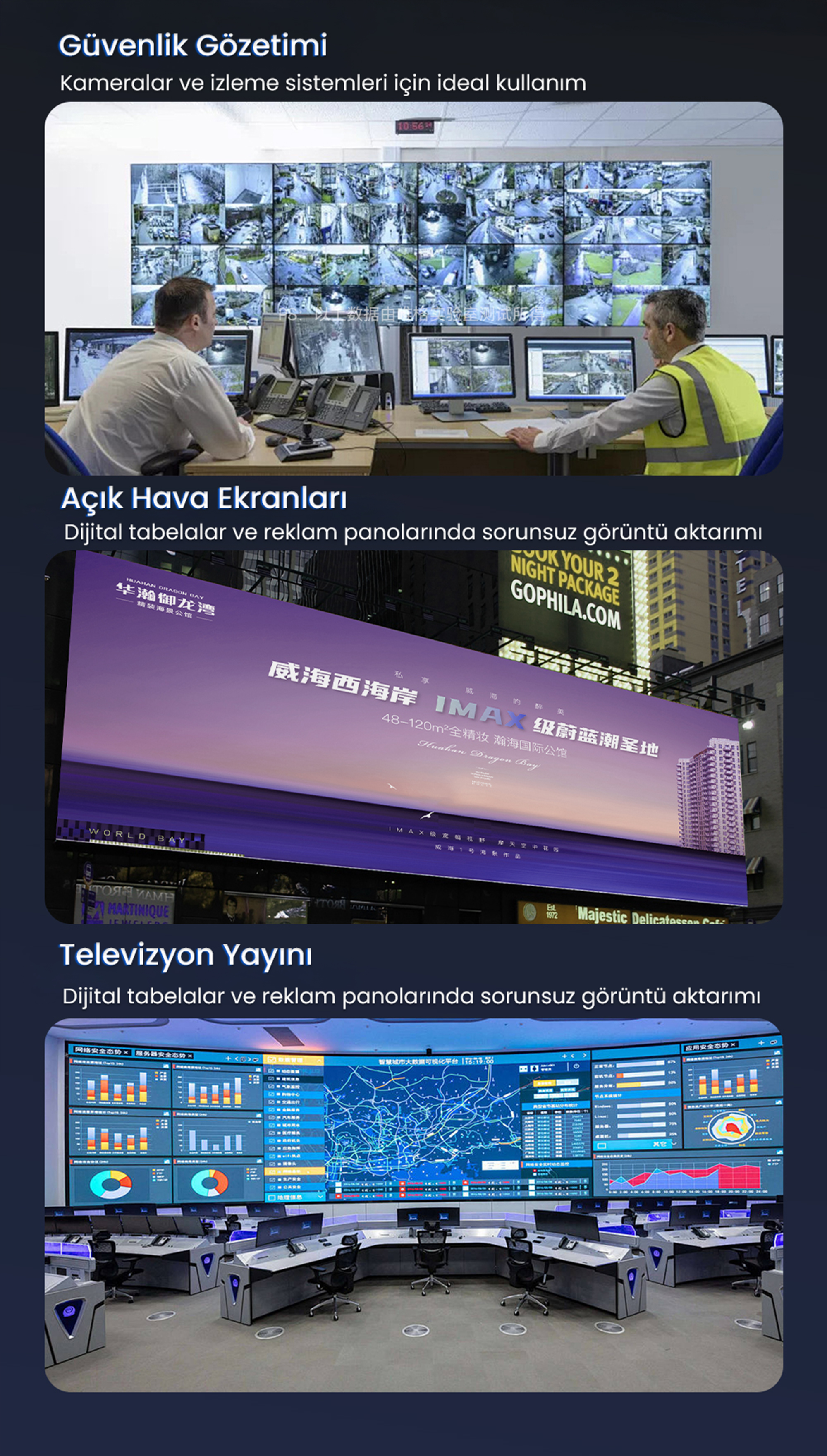 CAT5e / CAT6 HDMI Extender; dijital bilgilendirme ekranları, güvenlik izleme sistemleri, video konferans çözümleri, eğitim ve sunum sistemleri, LCD ve LED video wall uygulamaları ile büyük ekran projeksiyon projelerinde yaygın olarak kullanılmaktadır.