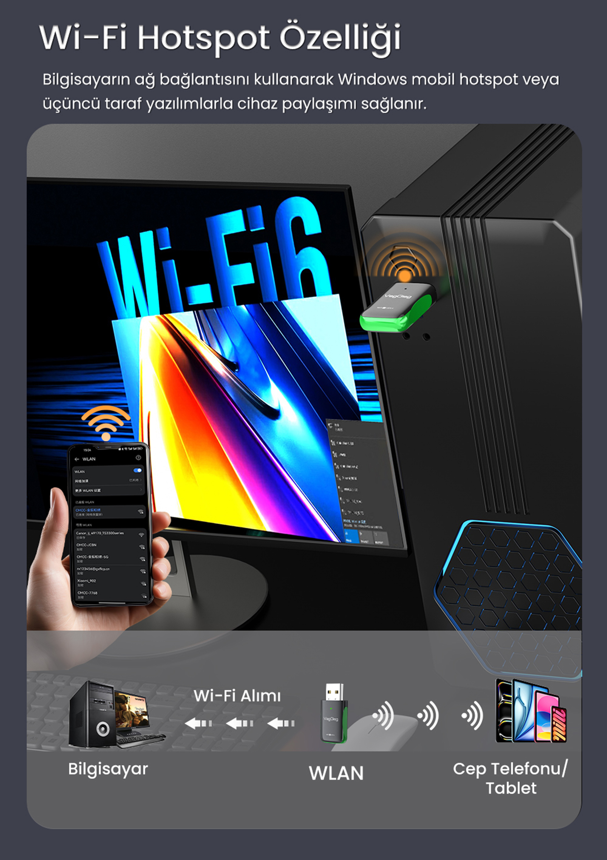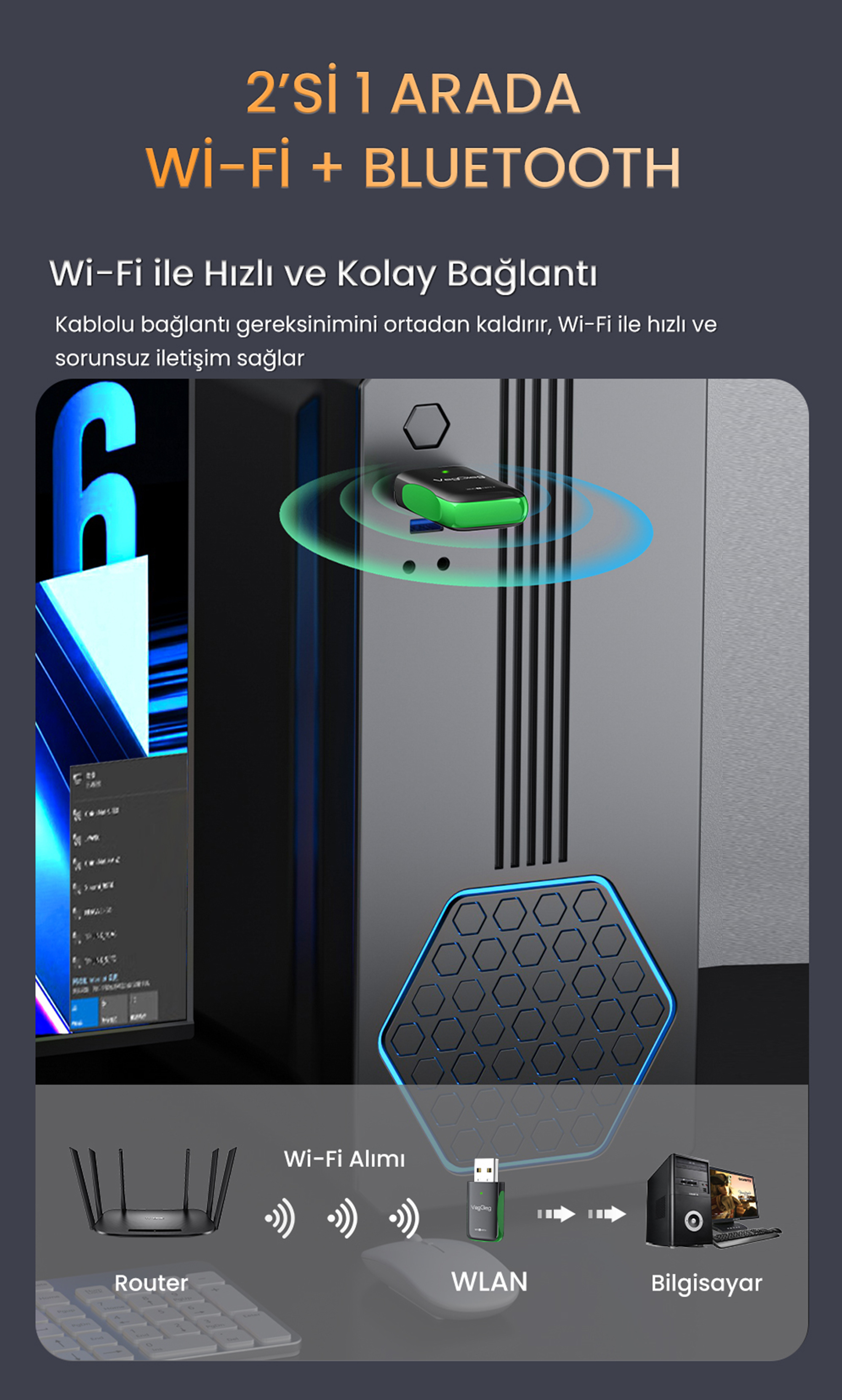 Küçük ve hafif tasarımı sayesinde VegGieg, dizüstü bilgisayar çantasında veya cepte rahatlıkla taşınabilir. Ev, ofis veya seyahat kullanımına uygun kompakt bir yapı sunar. Masaüstü bilgisayarlarda dahili kablosuz bağlantı ihtiyacını karşılamak için ideal bir çözümdür.