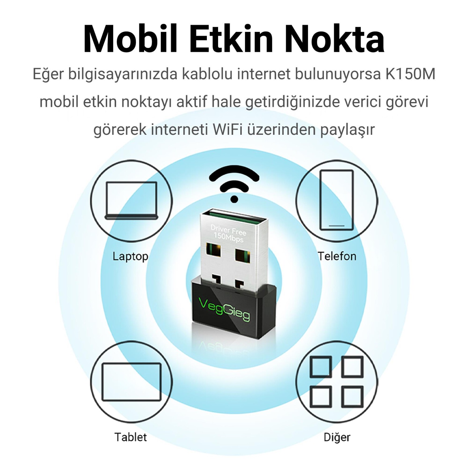 VegGieg K150M 150Mbps Wi-F alıcı verici USB adaptör, Wi-Fi özelliği bulunmayan masaüstü bilgisayarlarınıza veya WiFi çipi arızalanan notebook ve laptoplara kablosuz internet bağlantısı sağlamanız için tasarlanmıştır. 150Mbps aktarım hızını destekler böylece internet hızınızı kısıtlamadan tüm gücüyle kullanabilirsiniz. Verici özelliği sayesinde bilgisayarınıza gelen kablolu interneti modemden uzak ortamlarda kablosuz olarak paylaşarak telefon, tablet veya Wi-Fi üzerinden internete ihtiyaç duyan diğer cihazlarınız için daha hızlı bir kablosuz internet bağlantısı sağlar. K150M sahip olduğu entegre nano anten sayesinde hafif ve küçük bir tasarıma sahiptir. Aynı zamanda Nikel kaplaması sayesinde K150M paslanma aşınma gibi dış koşullara yüksek dayanıklılık gösterir böylece uzun ömürlü bir yapıya sahip olur. Tak çalıştır kullanımı sayesinde sürücü kurulumuna ihtiyaç duymadan hızlıca kullanmaya başlayabilirsiniz.