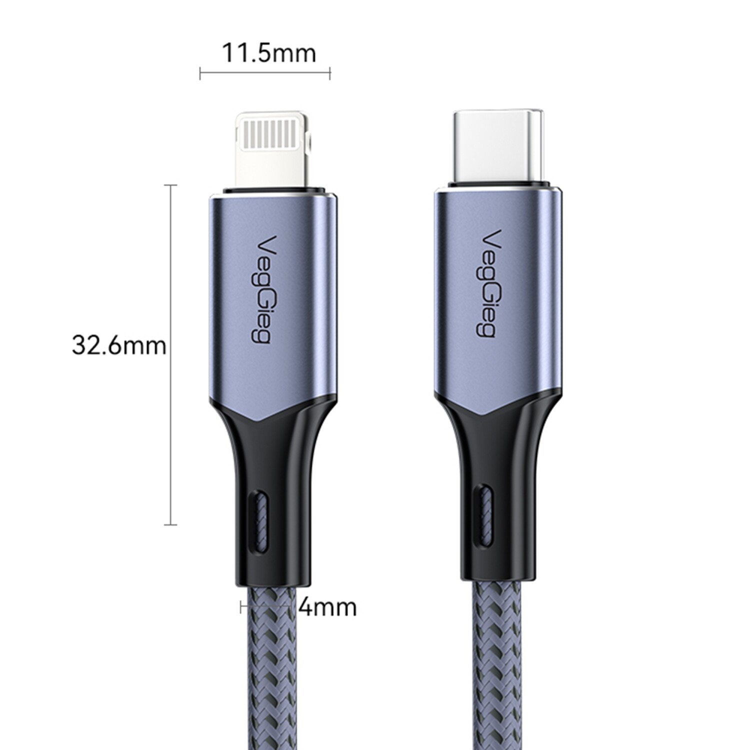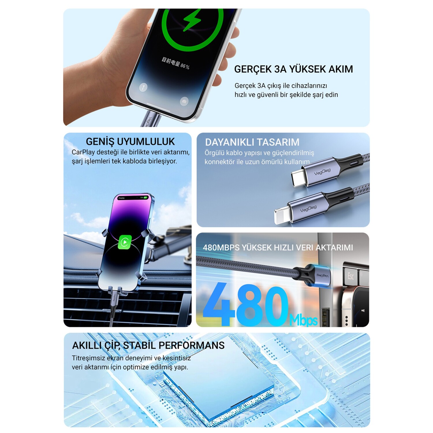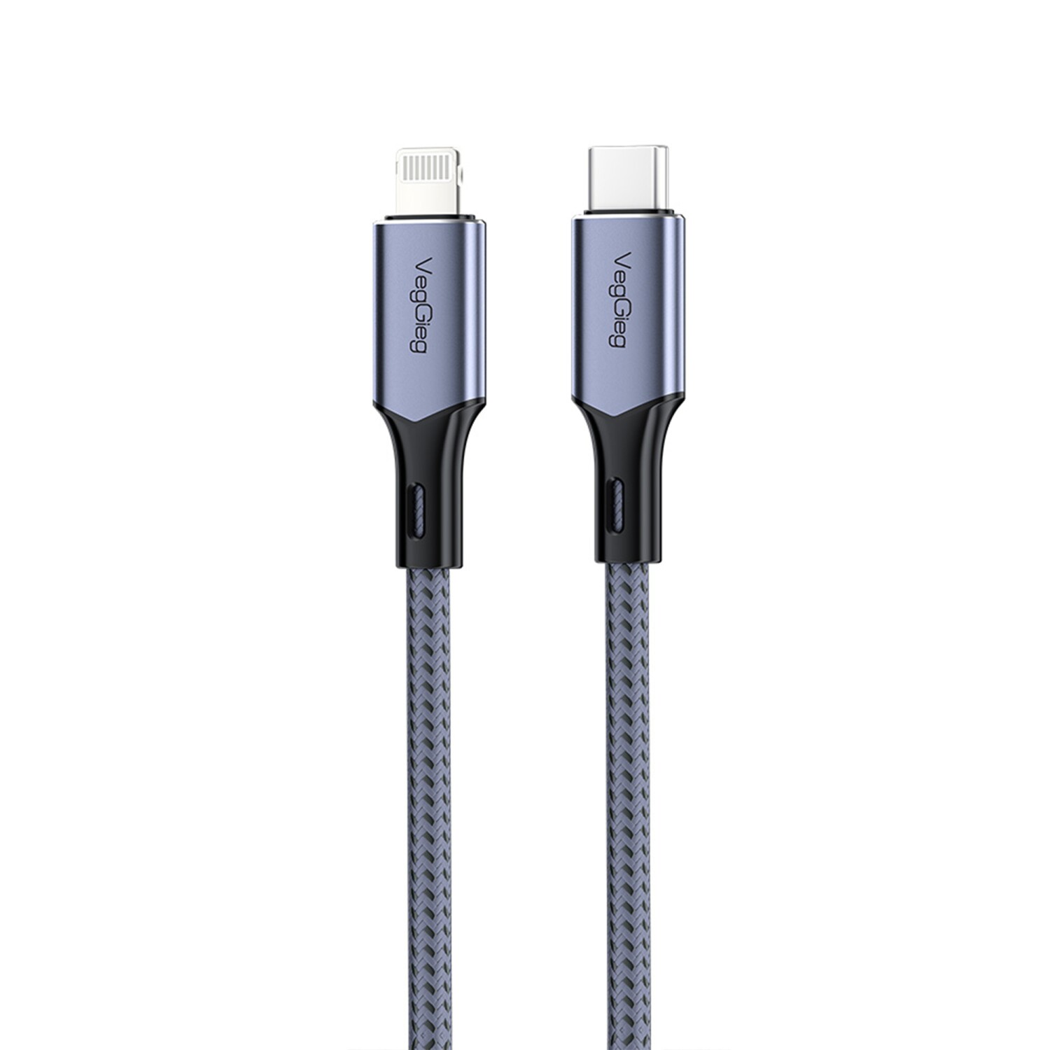Veggieg 27W 3A USB Type-C to Lightning şarj ve data kablosu, iPhone ve iPad kullanıcıları için özel olarak geliştirilmiş, yüksek hızlı lightning kablo teknolojisi sunar. 3A akım ve 27W güç desteğiyle iPhone 14’e kadar tüm modellerle uyumludur ve bazı iPad serileri ile de yüksek verimle çalışır. Dayanıklı örgülü yapısı sayesinde uzun ömürlü ve güvenli kullanım sağlar.
