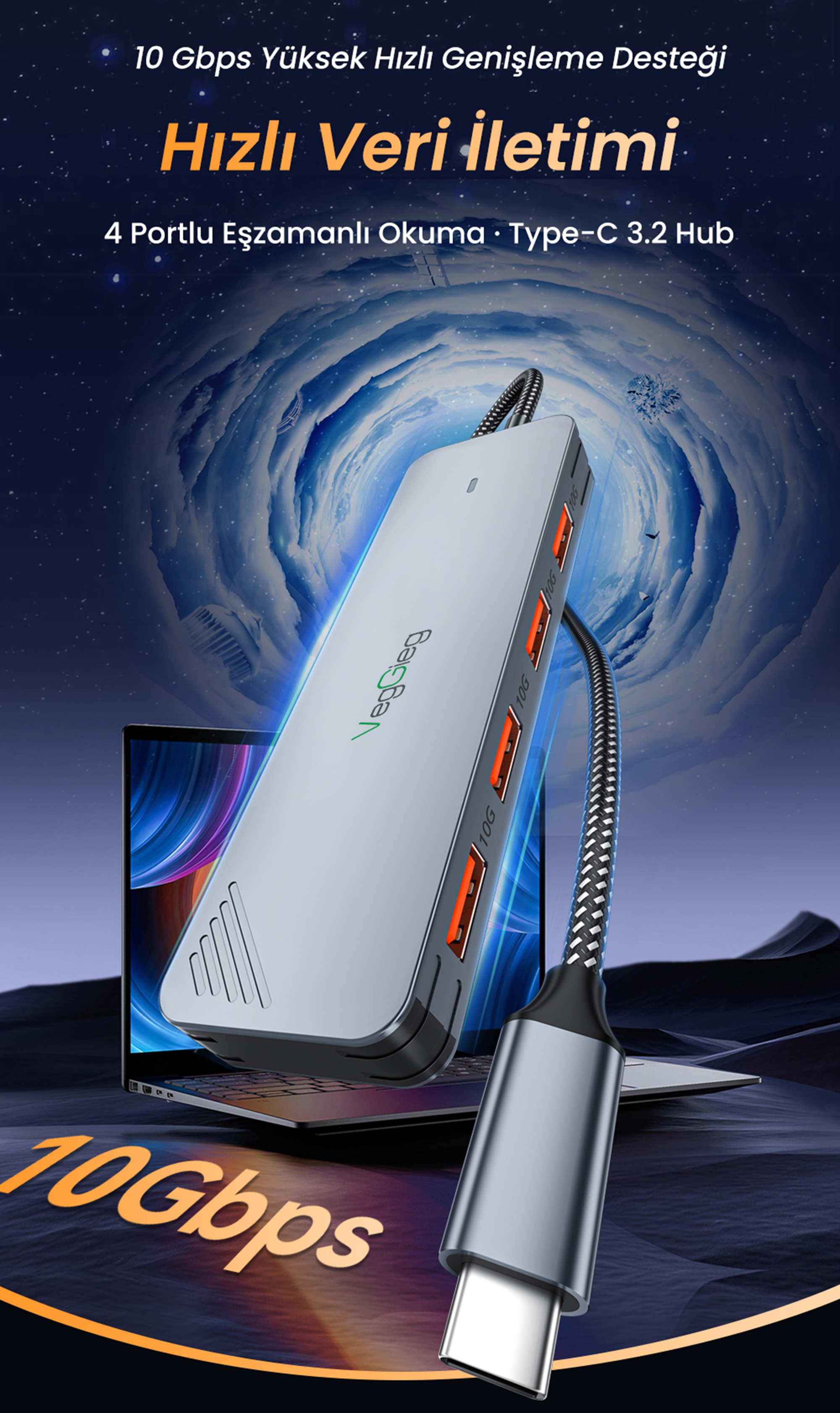 1 x VegGieg 4 Portlu 10Gbps Type-C to 4*USB-A 3.2 Gen2 Çoklayıcı Dönüştürücü Hub