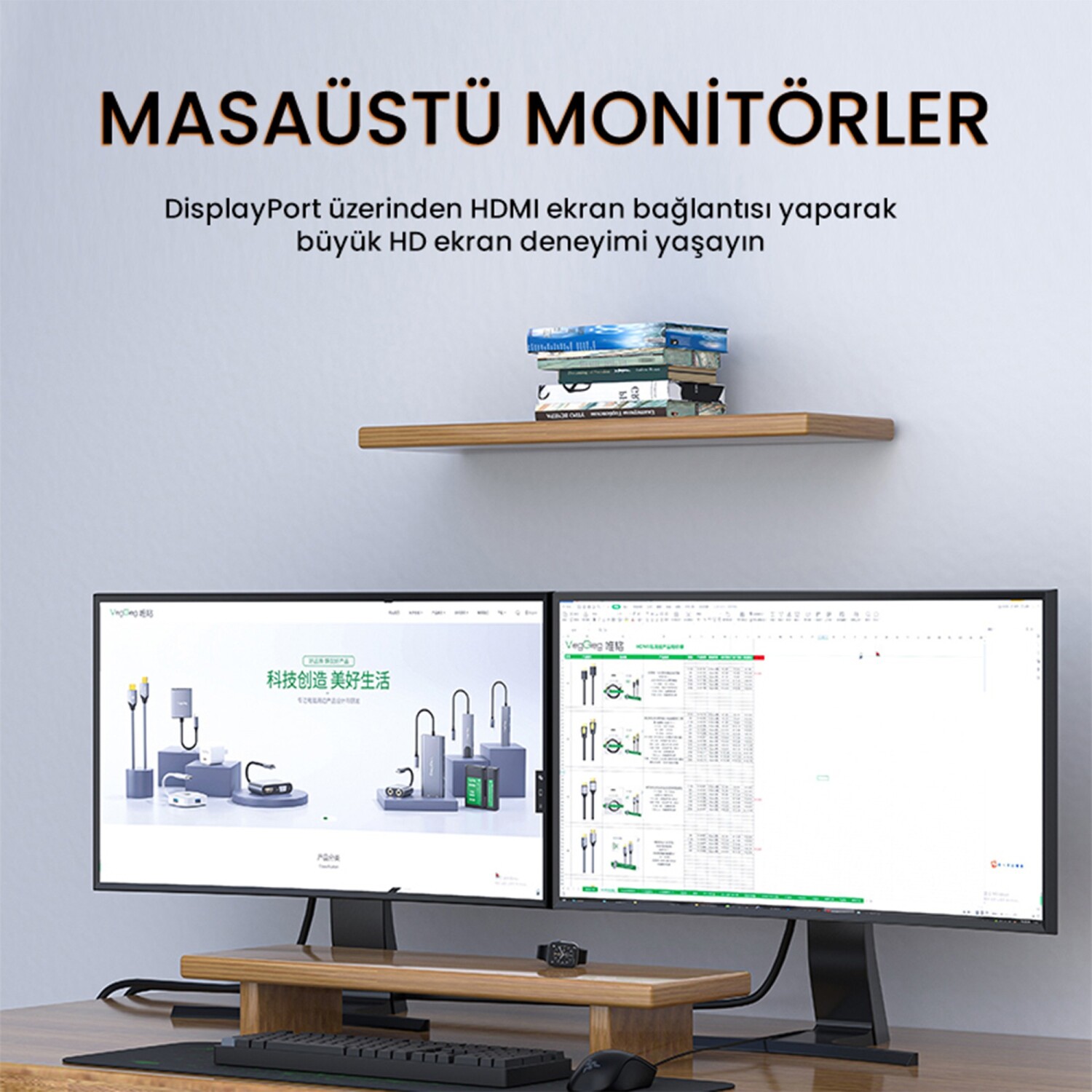 Veggieg 4K 30Hz DisplayPort to HDMI Dönüştürücü Kablo, DisplayPort çıkışına sahip bilgisayar, laptop veya diğer cihazlardan HDMI girişli monitör, televizyon ya da projektörlere yüksek kaliteli görüntü aktarımı yapmanızı sağlar. 4K çözünürlükte 30Hz, 2K çözünürlükte 60Hz tazeleme hızı desteğiyle net ve akıcı görüntüler sunarken, dahili yüksek performanslı çipi sayesinde ses ve video arasında tam senkronizasyon sağlar. Altın kaplama konnektörleri ve dayanıklı PVC dış kaplamasıyla uzun ömürlü ve kararlı bir bağlantı deneyimi sunar.