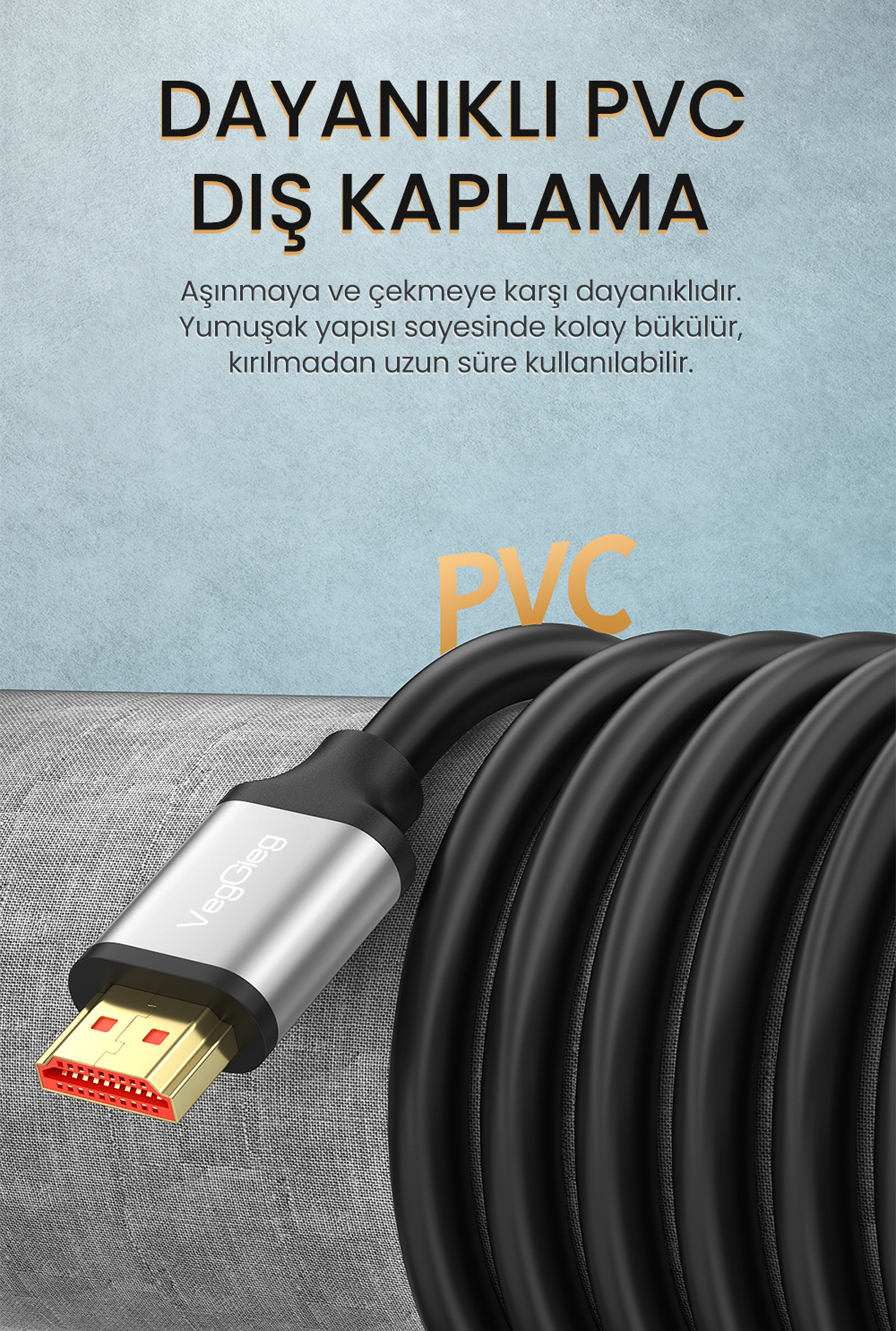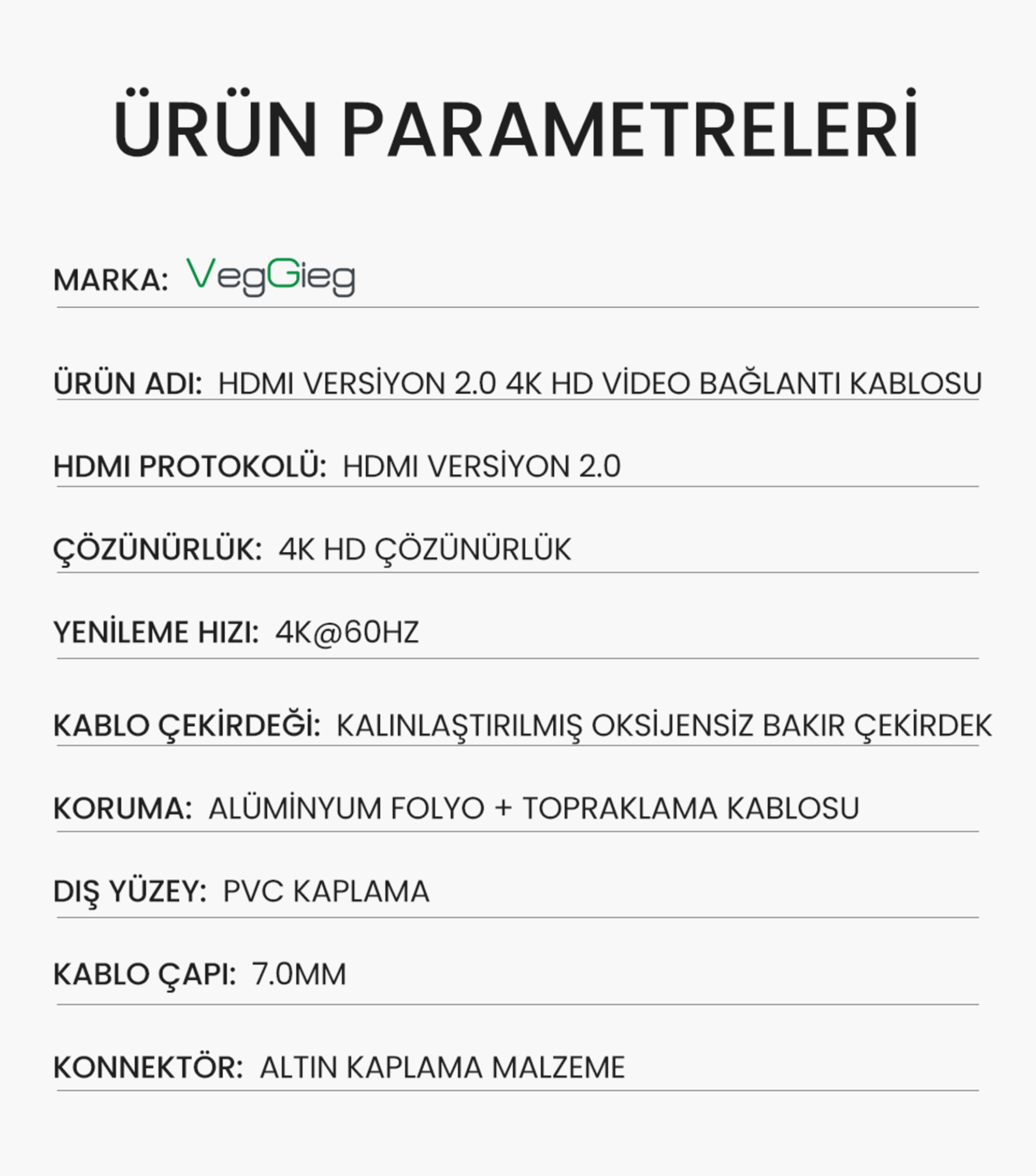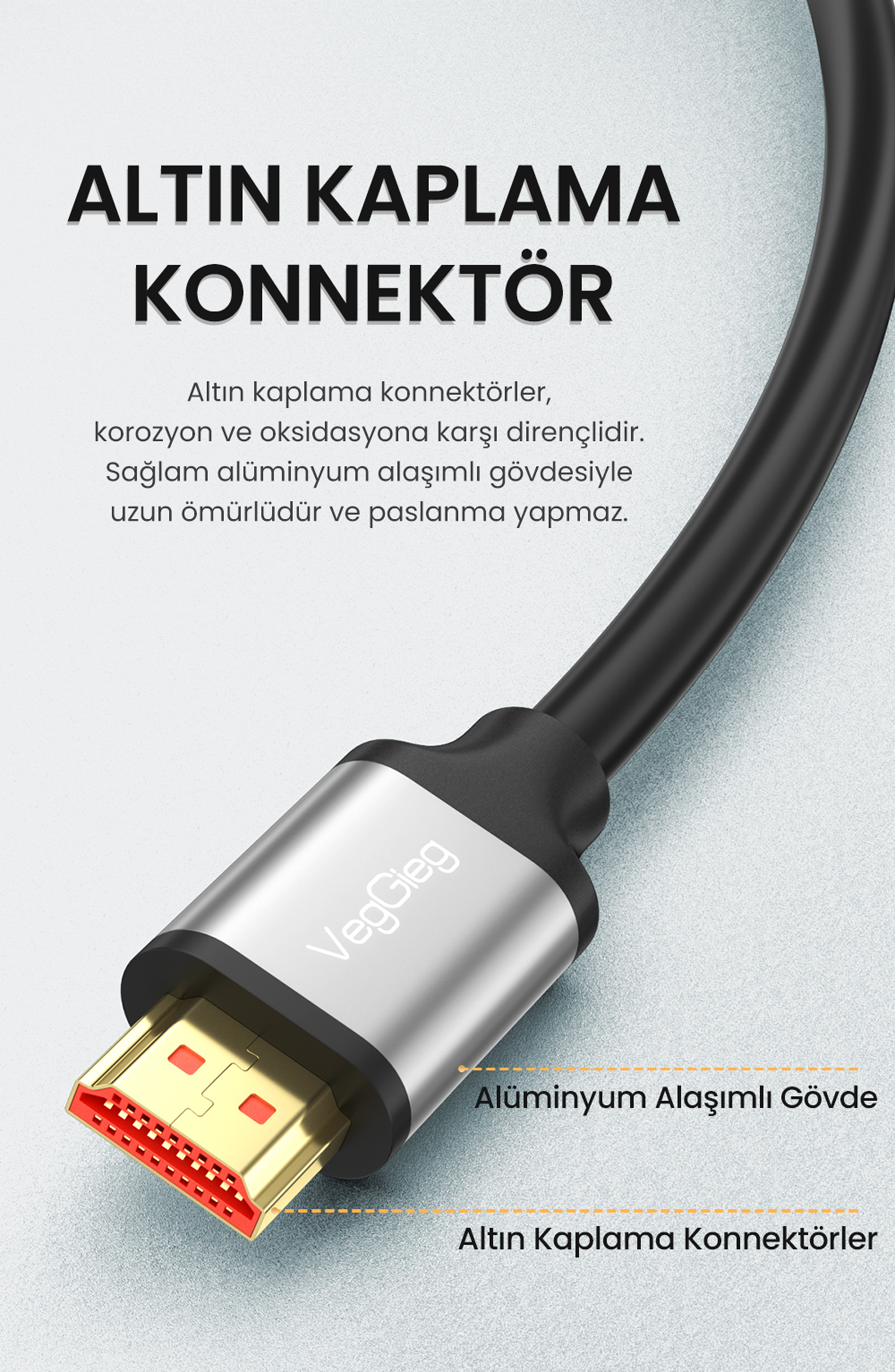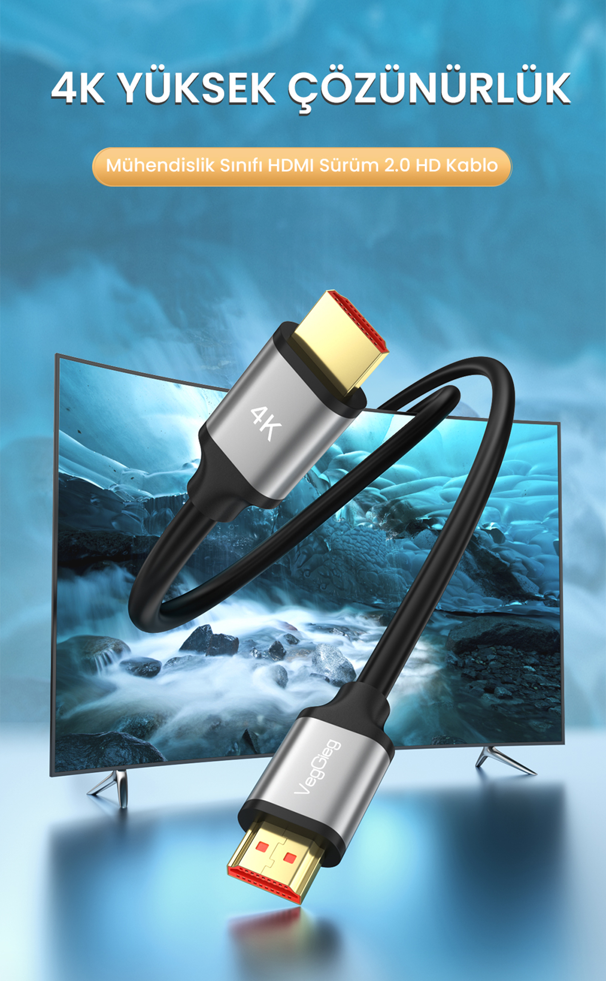 VegGieg 4K HDMI Kablosu, yüksek çözünürlükte görüntü ve ses aktarımı için tasarlanmış, dayanıklı ve performans odaklı bir bağlantı çözümüdür. 4K 60Hz destekli HDMI 2.0 teknolojisi, HDR ve 3D uyumluluğu ile televizyon, bilgisayar ve oyun konsollarınızda akıcı ve canlı bir izleme deneyimi sunar. Sağlam yapısı ve yüksek iletim kapasitesi sayesinde, hem ev eğlencesi hem de profesyonel kullanım için ideal bir tercihtir.