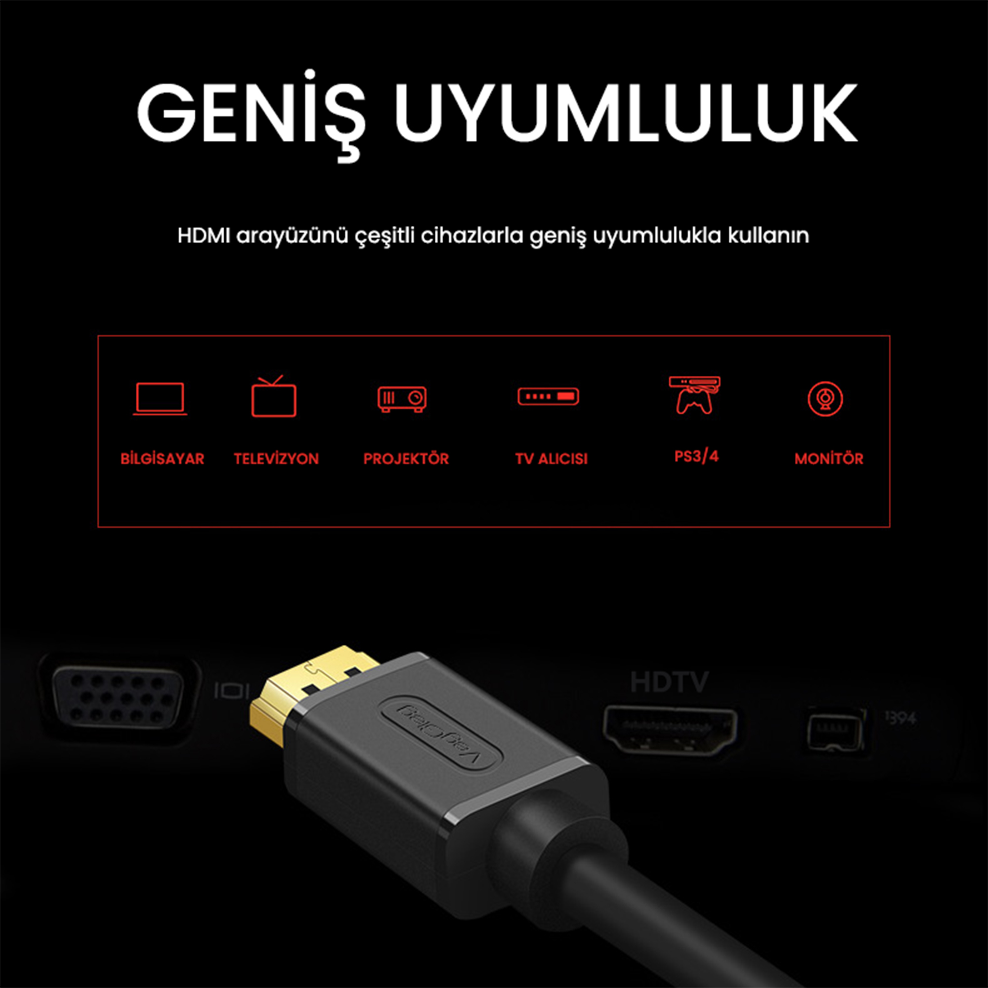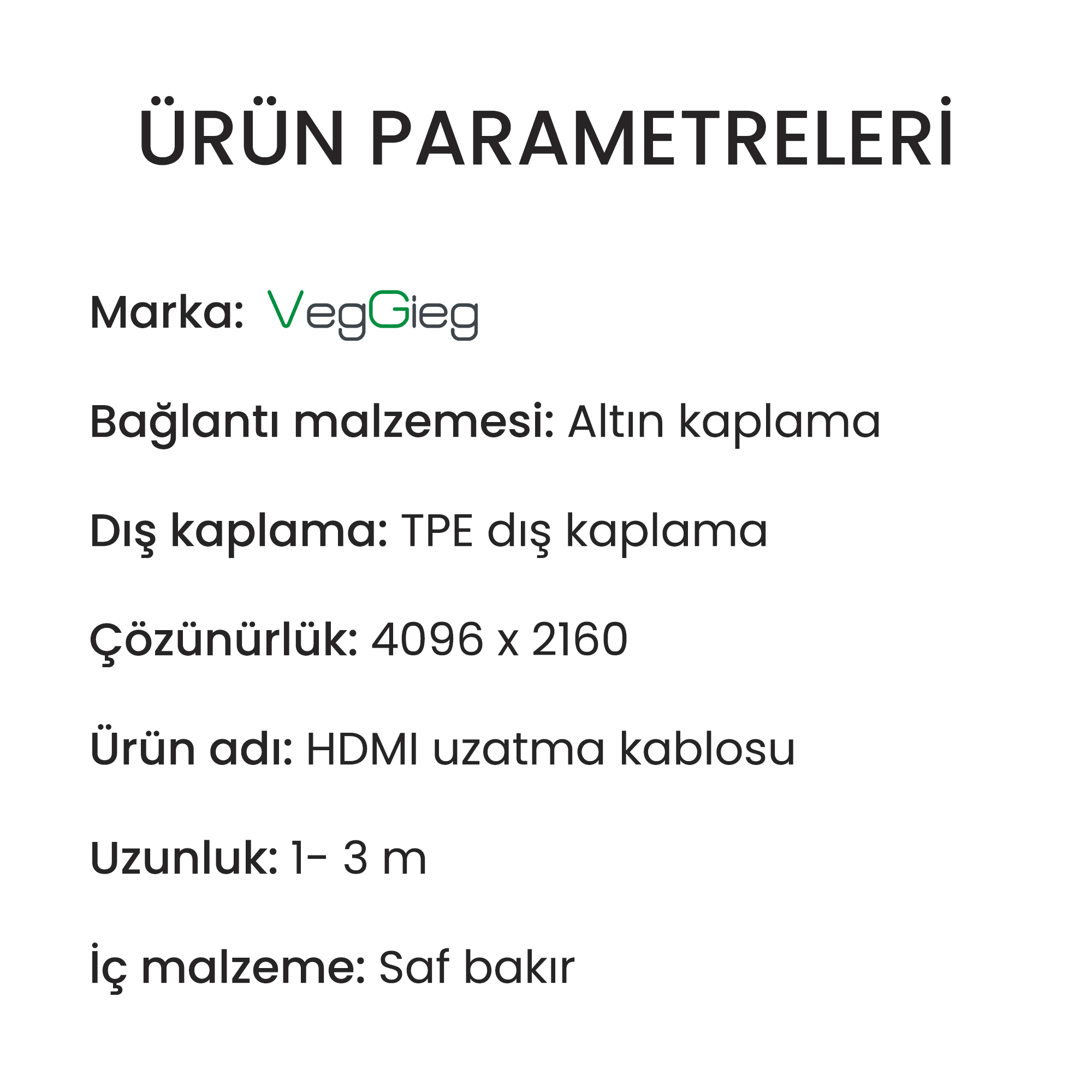 VegGieg HDMI 2.0 uzatma kablosu; HDTV, projektör, monitör, Blu-Ray oynatıcı, TV Box, oyun konsolu gibi tüm HDMI destekli cihazlarla uyumlu çalışır. Erkek–dişi uç yapısı sayesinde mevcut HDMI kablonuzu kolayca uzatarak esnek bağlantı imkânı sunar.