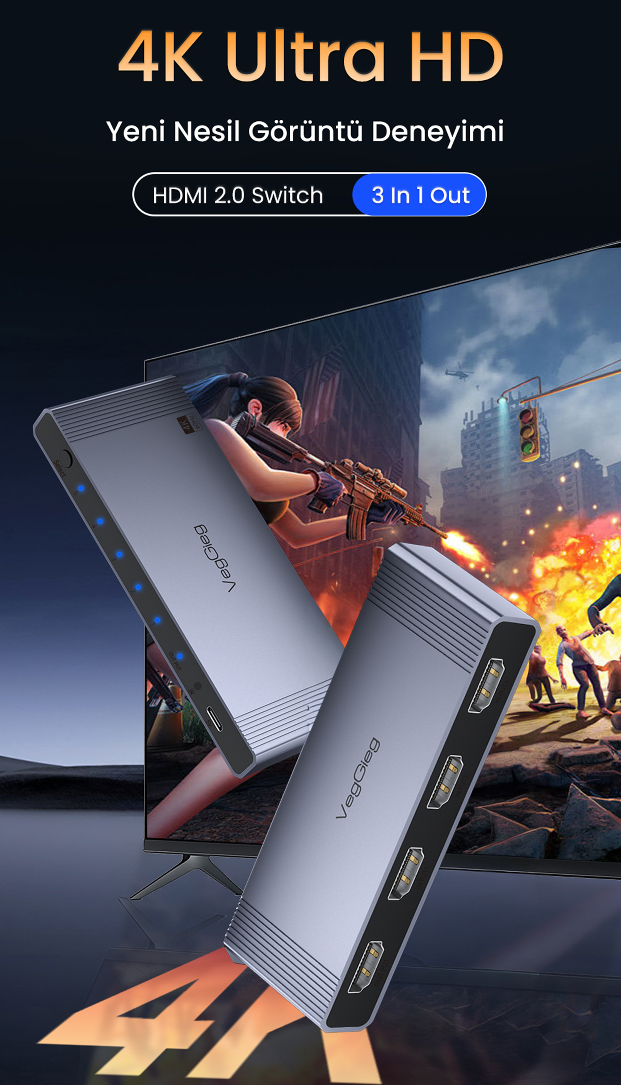 VegGieg HDMI 2.0 4K 3x1 Switcher, birden fazla HDMI kaynağını tek bir ekrana bağlamak isteyen kullanıcılar i