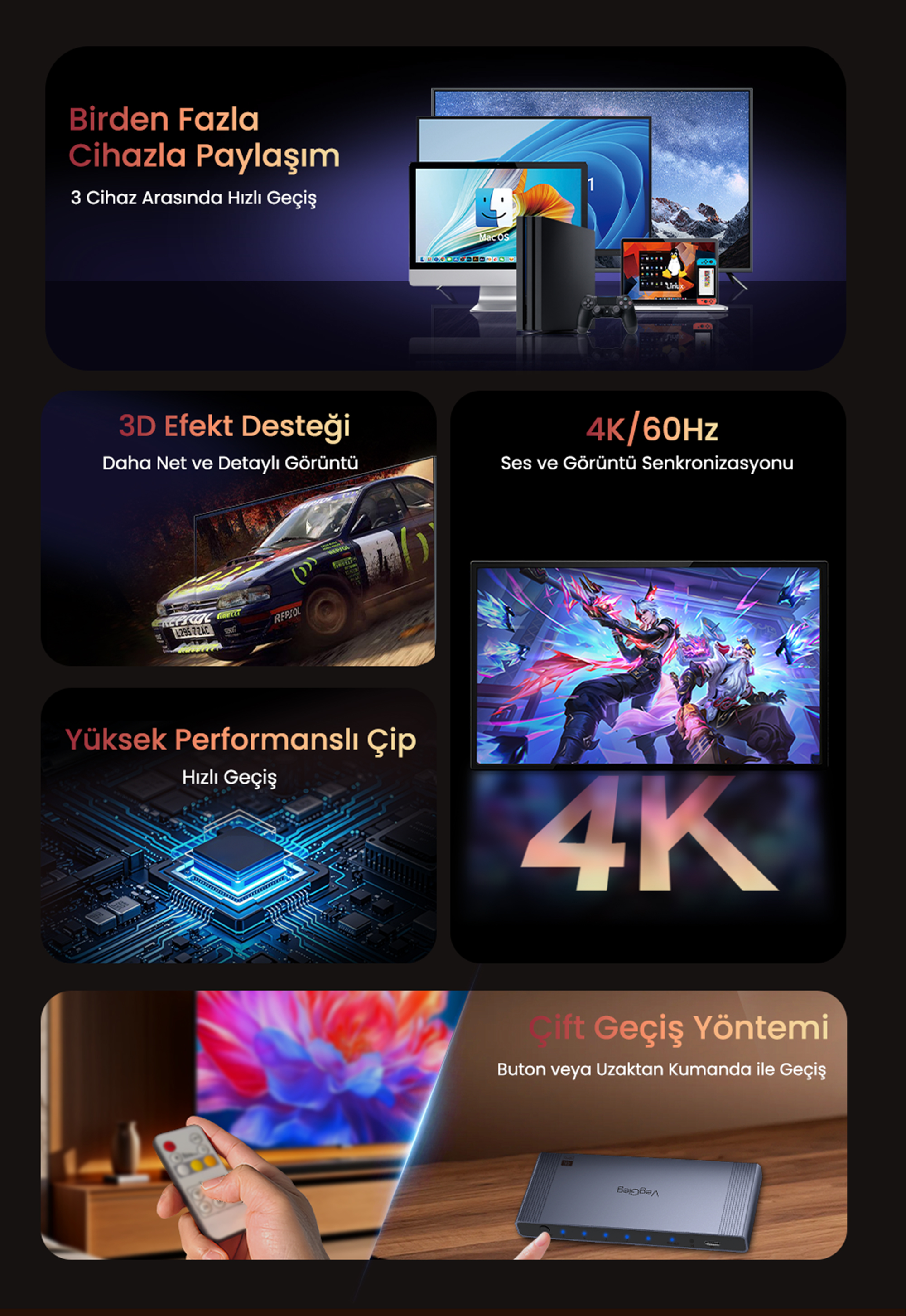ine sahip yapısıyla oyun konsolu, uydu alıcısı, medya oynatıcı veya bilgisayar gibi farklı cihazların tek bir ekrana bağlanmasına olanak tanır. 1 HDMI çıkış üzerinden görüntü aktarımı sağlayarak TV veya monitör üzerinde kolay geçiş imkanı sunar. Özellikle sınırlı HDMI portuna sahip ekranlar için işlevsel bir çözüm oluşturur.HDMI 2.0 Desteği ile 4K@60Hz G