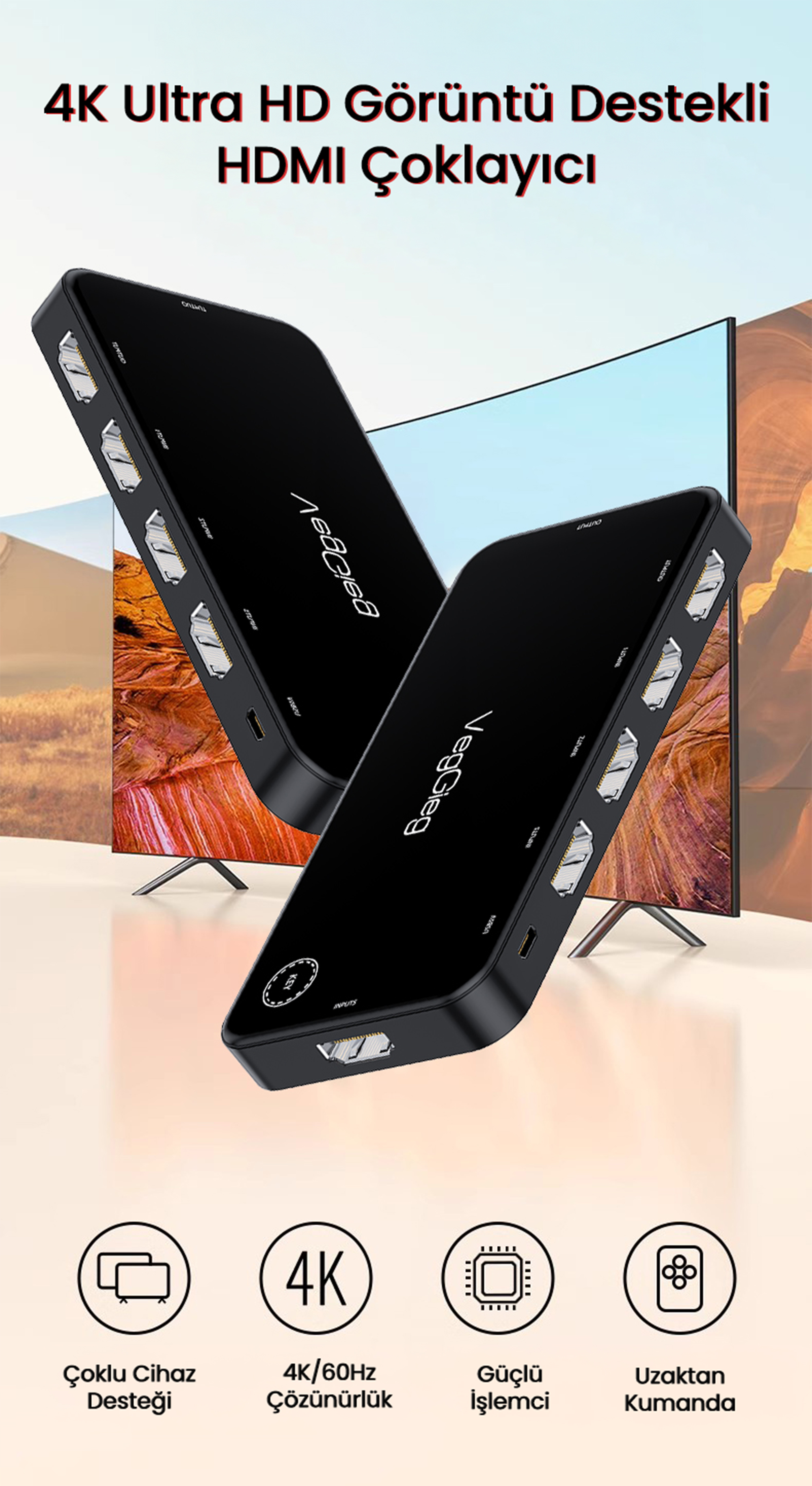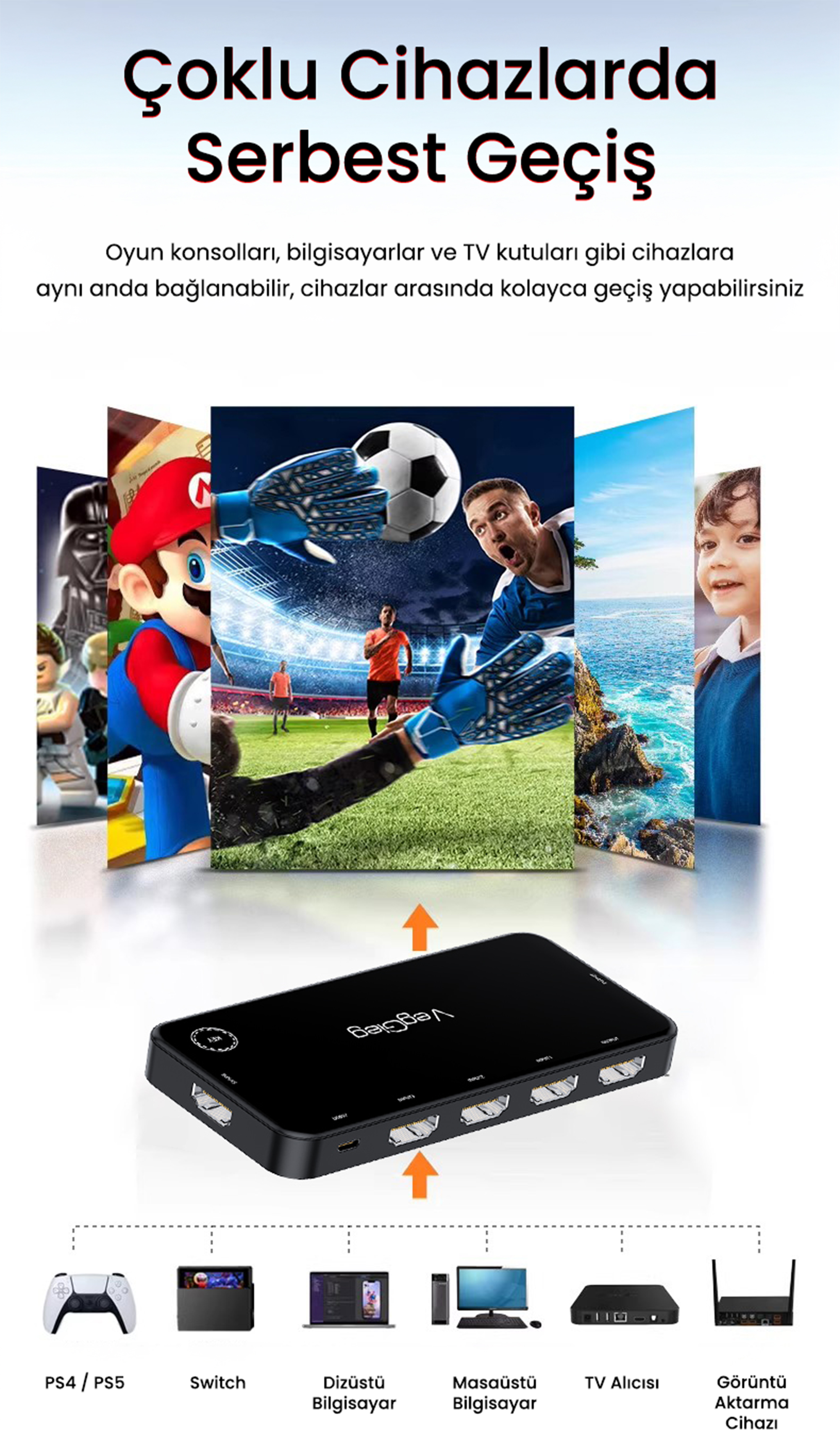 VegGieg 4K HDMI 2.0 5 Giriş 1 Çıkış Kumandalı Görüntü Seçici Switch, ev sinema sistemleri, oyun konsolları, medya oynatıcılar ve bilgisayarlar arasında HDMI bağlantılarını yönetmeyi kolaylaştıran akıllı bir HDMI anahtarlayıcıdır. 5 farklı HDMI girişini tek bir HDMI çıkışına yönlendirerek kablo karmaşasını ortadan kaldırır ve yüksek çözünürlüklü 4K görüntü kalitesini kesintisiz şekilde sunar. Hem ev kullanıcıları hem de profesyonel sistem kurulumları için ideal bir çözümdür.