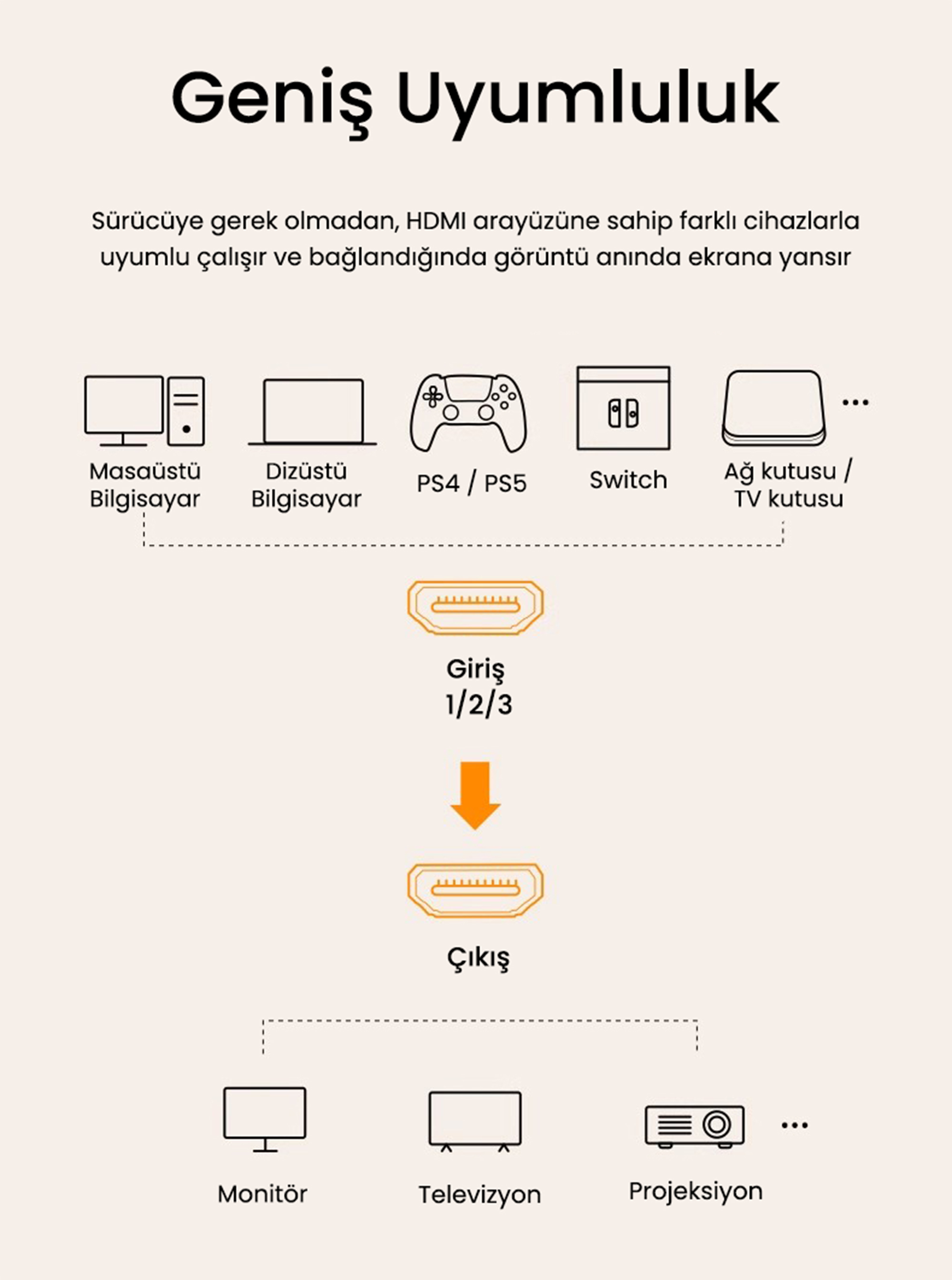 Geniş UyumlulukBu HDMI switch; TV, projektör, monitör, oyun konsolu (PS4/PS5, Xbox), medya oynatıcı, bilgisayar, dizüstü bilgisayar ve uydu alıcısı gibi çok çeşitli cihazlarla uyumludur. 3D video desteği sayesinde 3 boyutlu içerikleri de rahatlıkla izleyebilirsiniz.