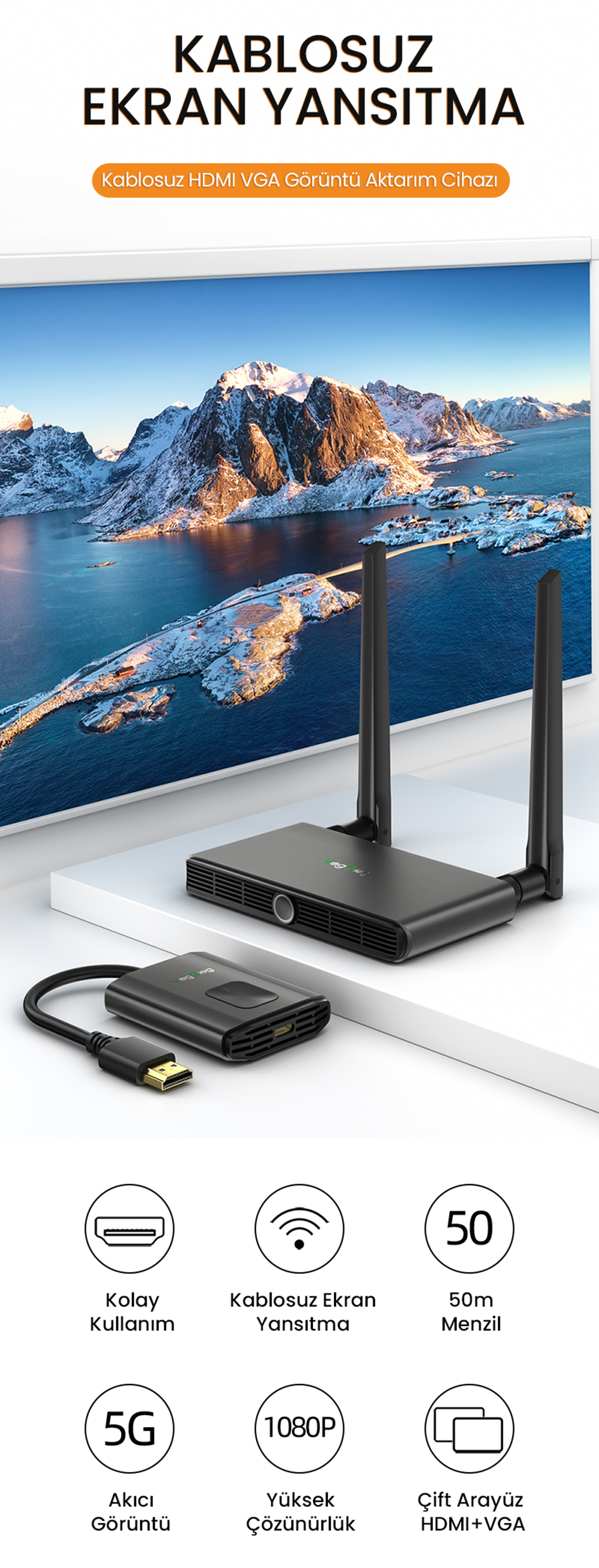 Cihaz, 1080P 60Hz Full HD çözünürlük desteği ile net, canlı ve keskin görüntüler sunar. Film, sunum, kamera yayını veya bilgisayar ekranı yansıtma gibi tüm işlemlerde yüksek kalite ve düşük gecikme performansı sağlar.